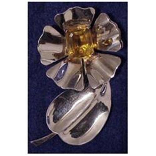 This 1950s three dimensional leaf and flower brooch (pin) has excellent design. A very large citrine colored stone (20mm x 16mm) unfoiled. Hallmarked sterling. This pin is 3 3/4" long and 2 1/8" wide. This very large sterling pin definitely makes a statement.