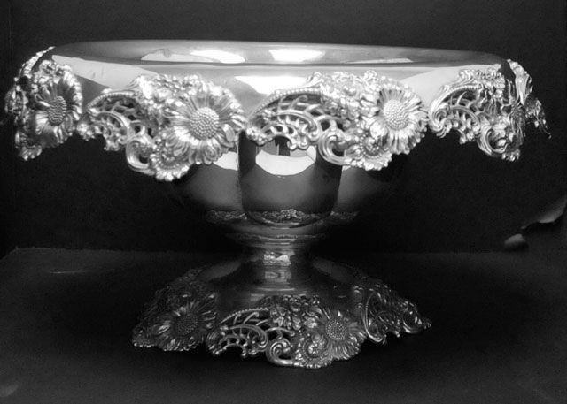 19th c., made by Dominick & Haff, sold by Harris & Shafer. Approx. 6.5" H x 12", 44 ozt. Please read our terms of sale.