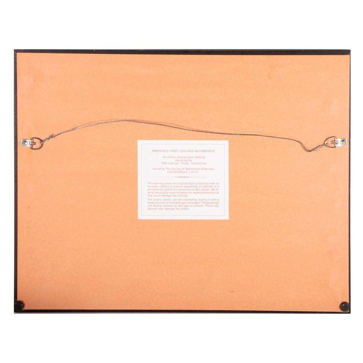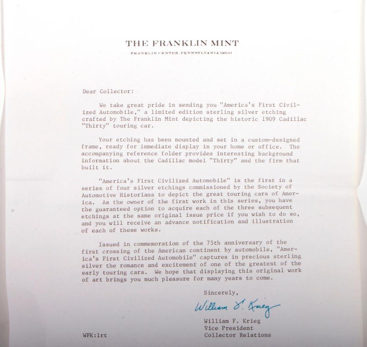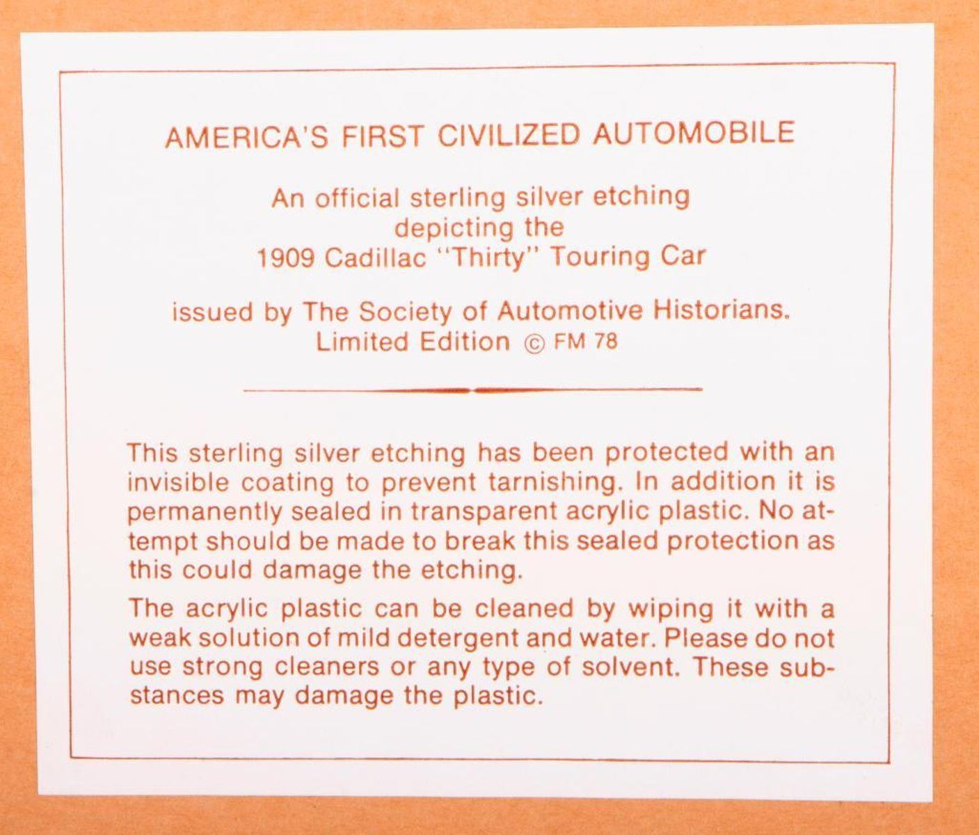 A sterling silver etching of "America's first civilized automobile" with Franklin Mint documentation measuring 14 1/4 inches high x 18 1/4.