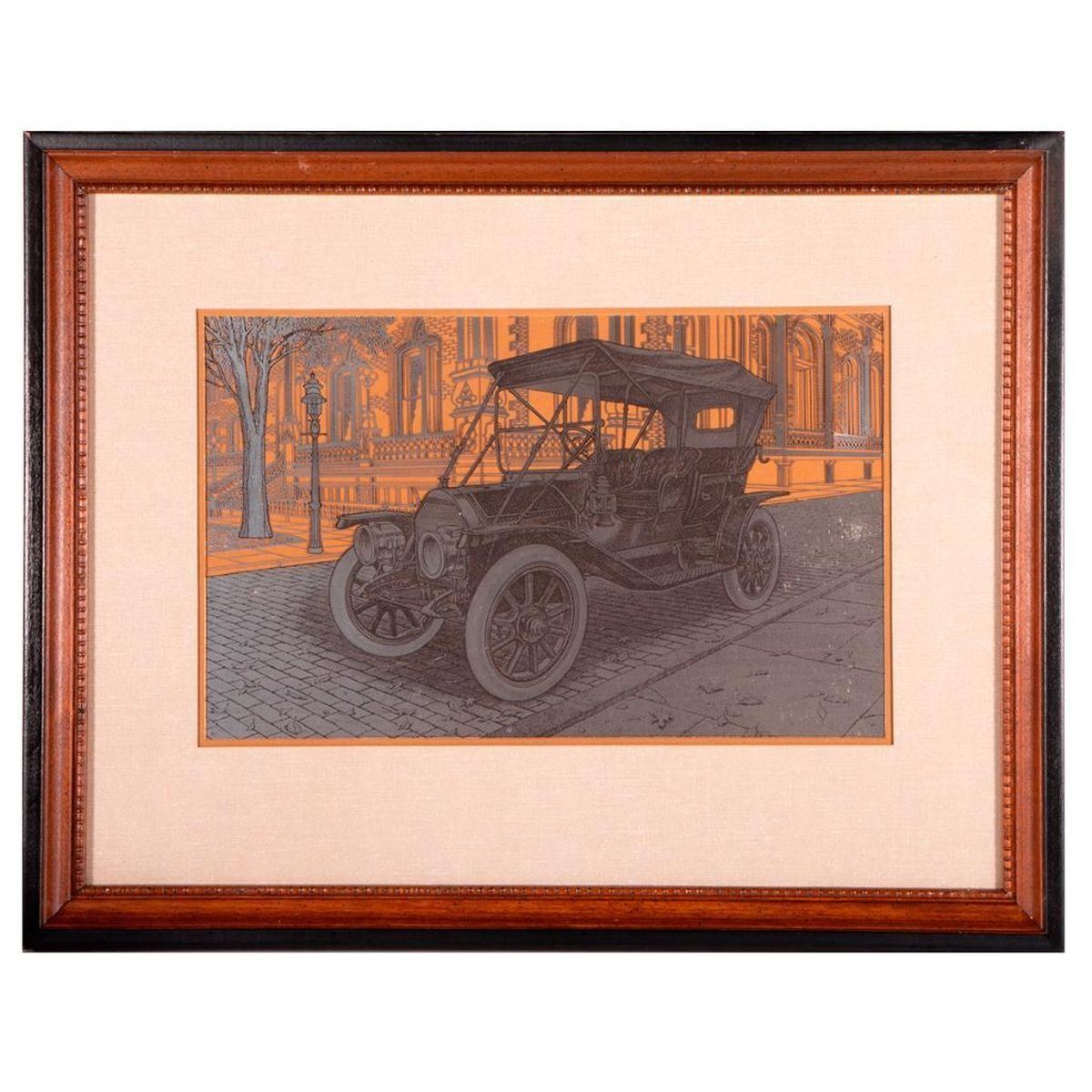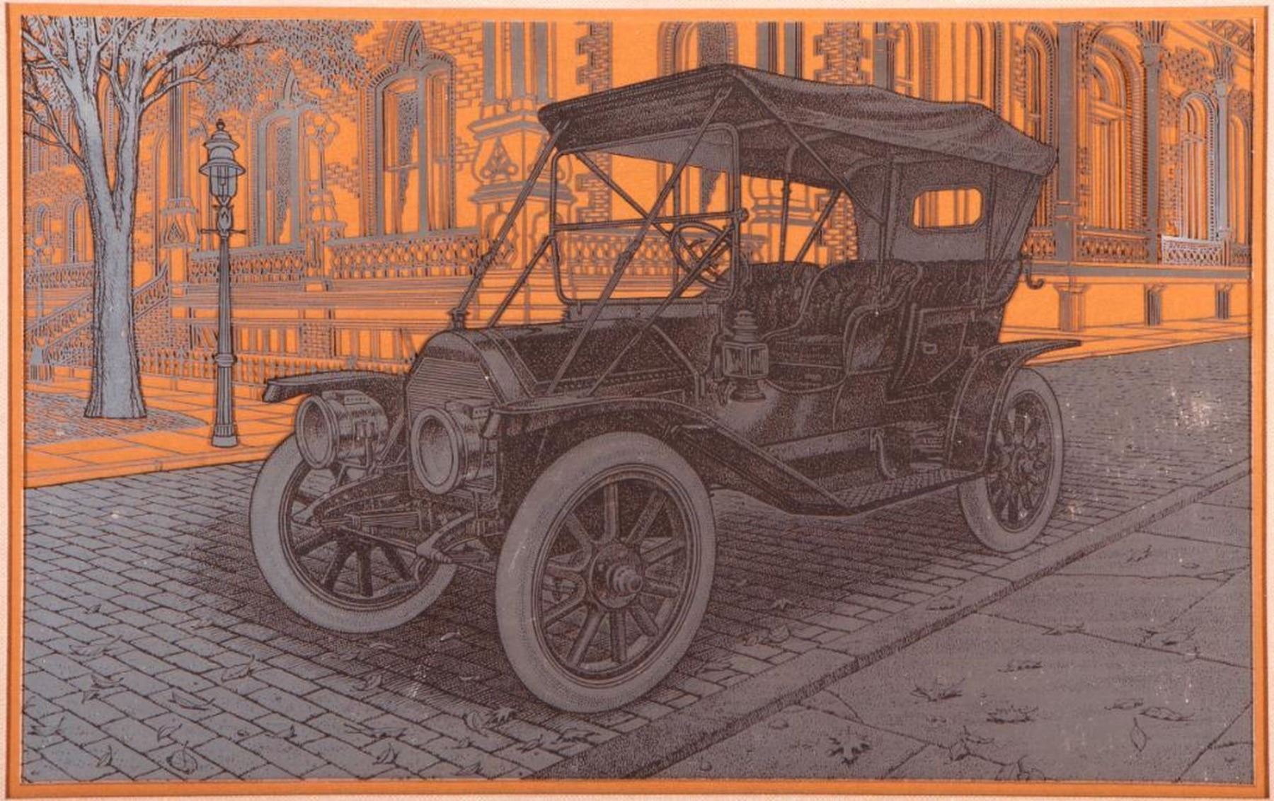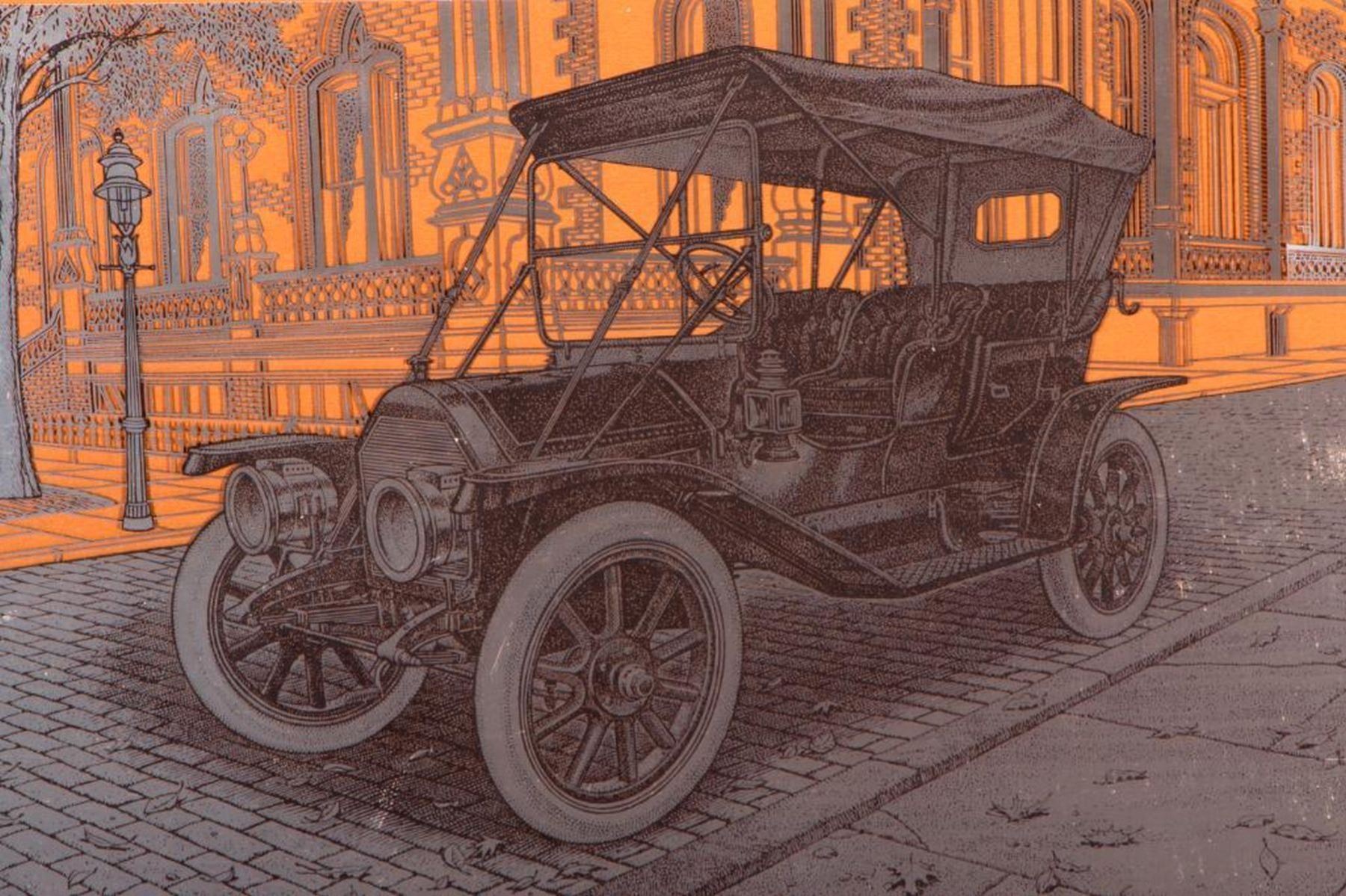 A sterling silver etching of "America's first civilized automobile" with Franklin Mint documentation measuring 14 1/4 inches high x 18 1/4.