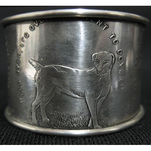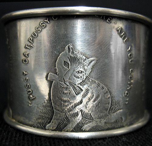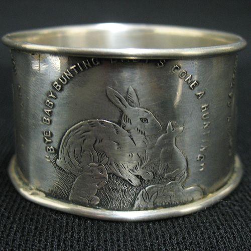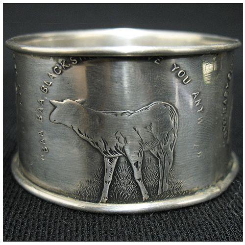 Sterling silver napkin ring with nursery rhyme and animal motif; early 20th C.; 1 1/4 inch high x 2 inch diameter (slight denting at seam)