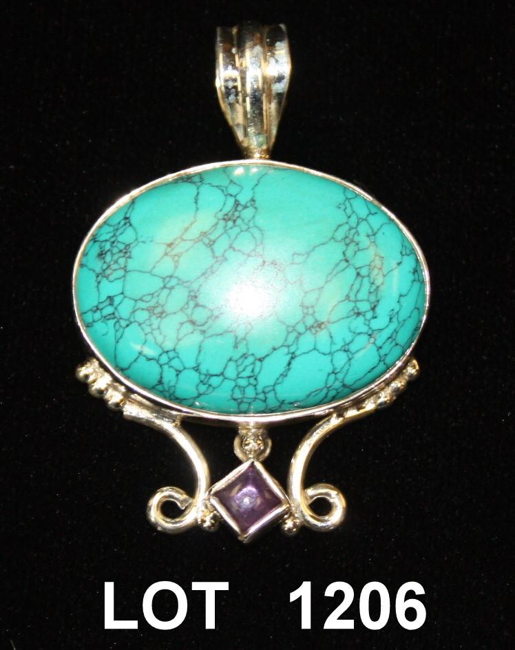 Sterling silver pendant showing turquoise and amethyst cabochon. Est: $100-$150.