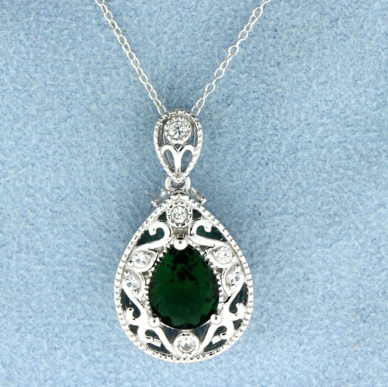 Stunning Vintage and gallery style pear shaped pendant with spectacular pear cut lab Emerald center gemstone and accented with white sapphires and an 18" sterling silver chain. 3.9g