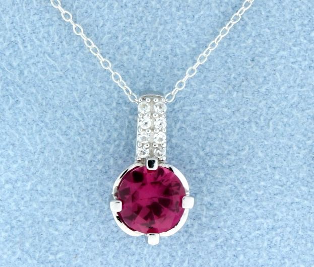 Darling drop style sterling silver pendant with gorgeous round cut lab Ruby gemstone and sparkling white sapphire shank. The chain is also sterling silver and measures 18" long. 2.2g