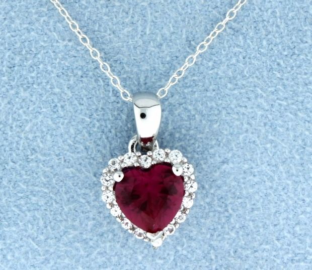 Breath taking sterling silver heart shaped pendant with fantastic lab Ruby heart gemstone set in a Halo of white sapphires that dangles from an 18" sterling silver chain. 2.0g
