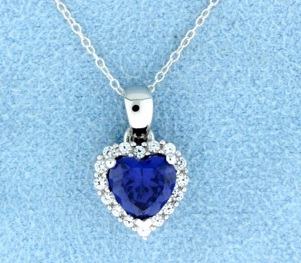Breath taking sterling silver heart shaped pendant with fantastic lab Tanzanite heart gemstone set in a Halo of white sapphires that dangles from an 18" sterling silver chain. 2.2g