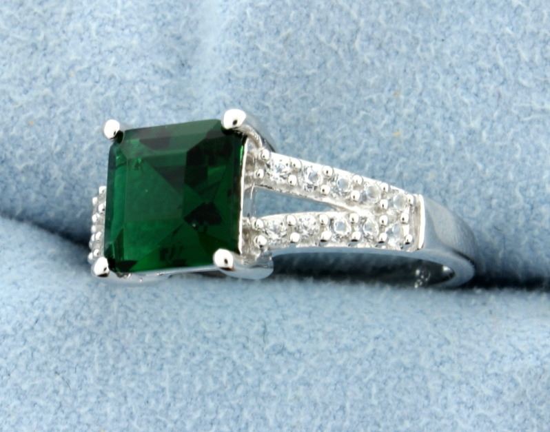 Fantastic style sterling silver ring with gorgeous square cut lab Emerald center gemstone set in great split shank style setting accented with white sapphires. Size 8 2.8g