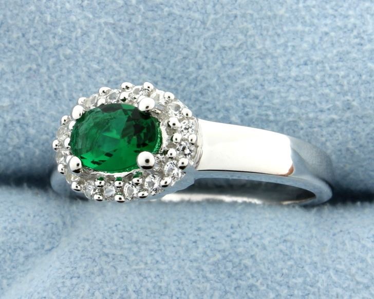 Exquisite sterling silver ring with fabulous oval cut lab Emerald gemstone set sideways to offer a spectacular look. Beautiful white sapphires surround the center gemstone. Size 8 5.1g