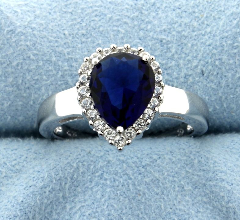 Stunning sterling silver ring with huge pear cut lab Sapphire center gemstone accented with white sapphires all around in a Halo style setting. Size 8 3.2g