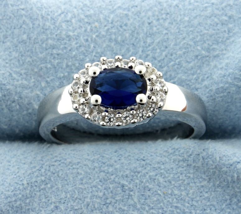 Exquisite sterling silver ring with fabulous oval cut lab Sapphire gemstone set sideways to offer a spectacular look. Beautiful white sapphires surround the center gemstone. Size 8 5.0g