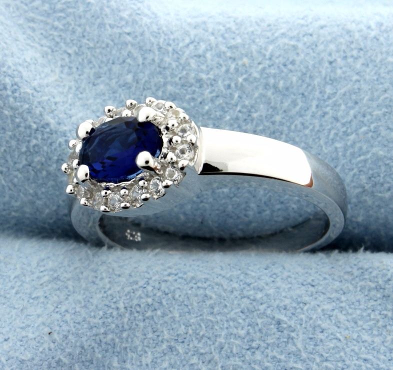 Exquisite sterling silver ring with fabulous oval cut lab Sapphire gemstone set sideways to offer a spectacular look. Beautiful white sapphires surround the center gemstone. Size 8 5.0g
