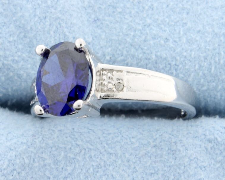 What a look! This exquisite sterling silver ring with gorgeous oval cut lab created Tanzanite center is stunning! There are 0.01 carats of diamonds that complete this beautiful piece of jewelry. 3.0g Size 7
