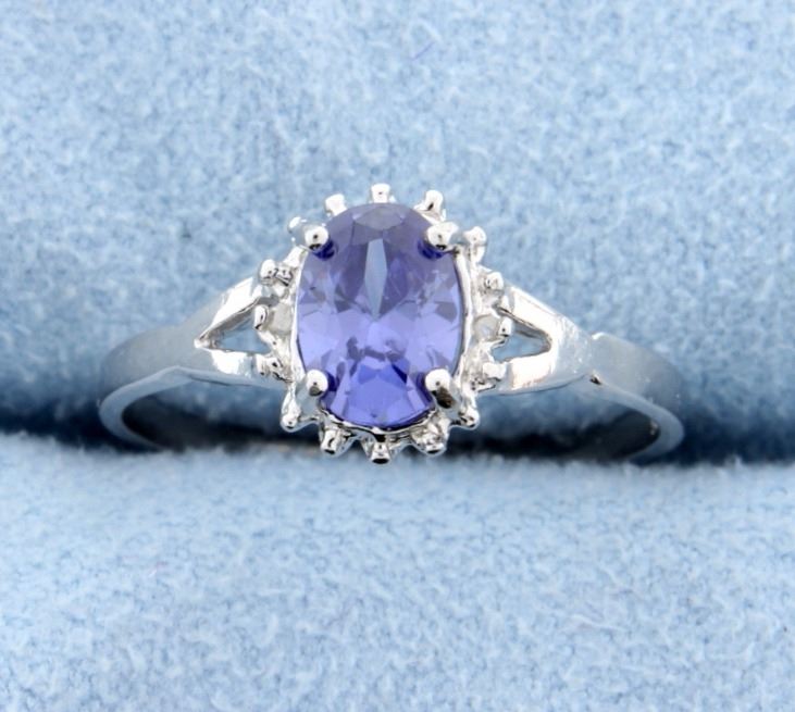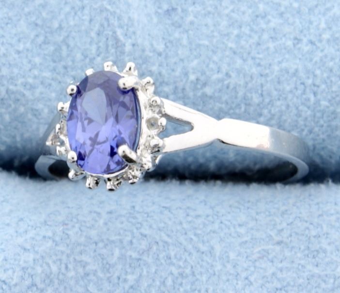 Beautiful sterling silver ring with fantastic oval cut lab created Tanzanite center and accented with 0.01 carats of diamonds 1.5g Size 7