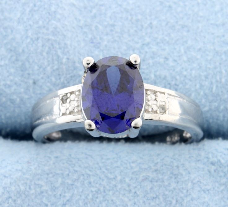 What a look! This exquisite sterling silver ring with gorgeous oval cut lab created Tanzanite center is stunning! There are 0.01 carats of diamonds that complete this beautiful piece of jewelry. 3.0g Size 7