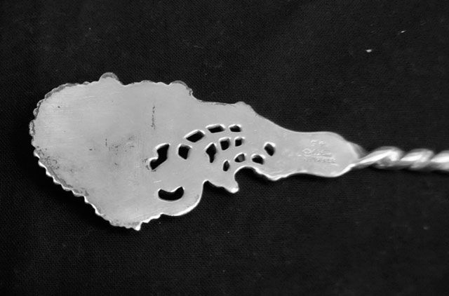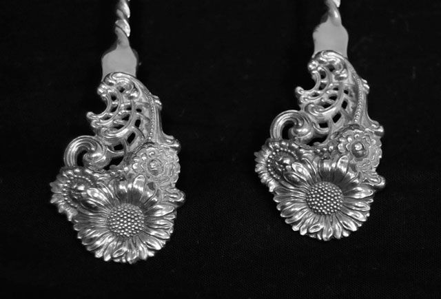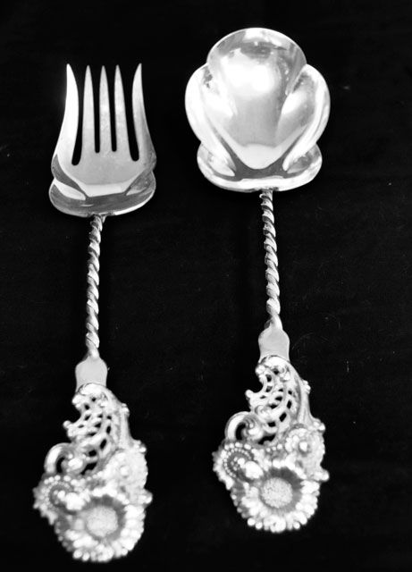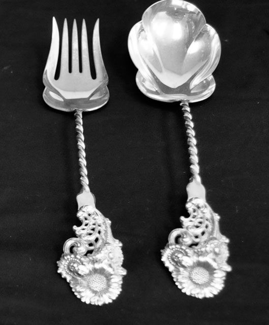 Made by Dominick & Haff, with "Floral" design on twist handles. Approx. 9.5", 174 grams, 5.5 ozt. Please read our terms of sale.