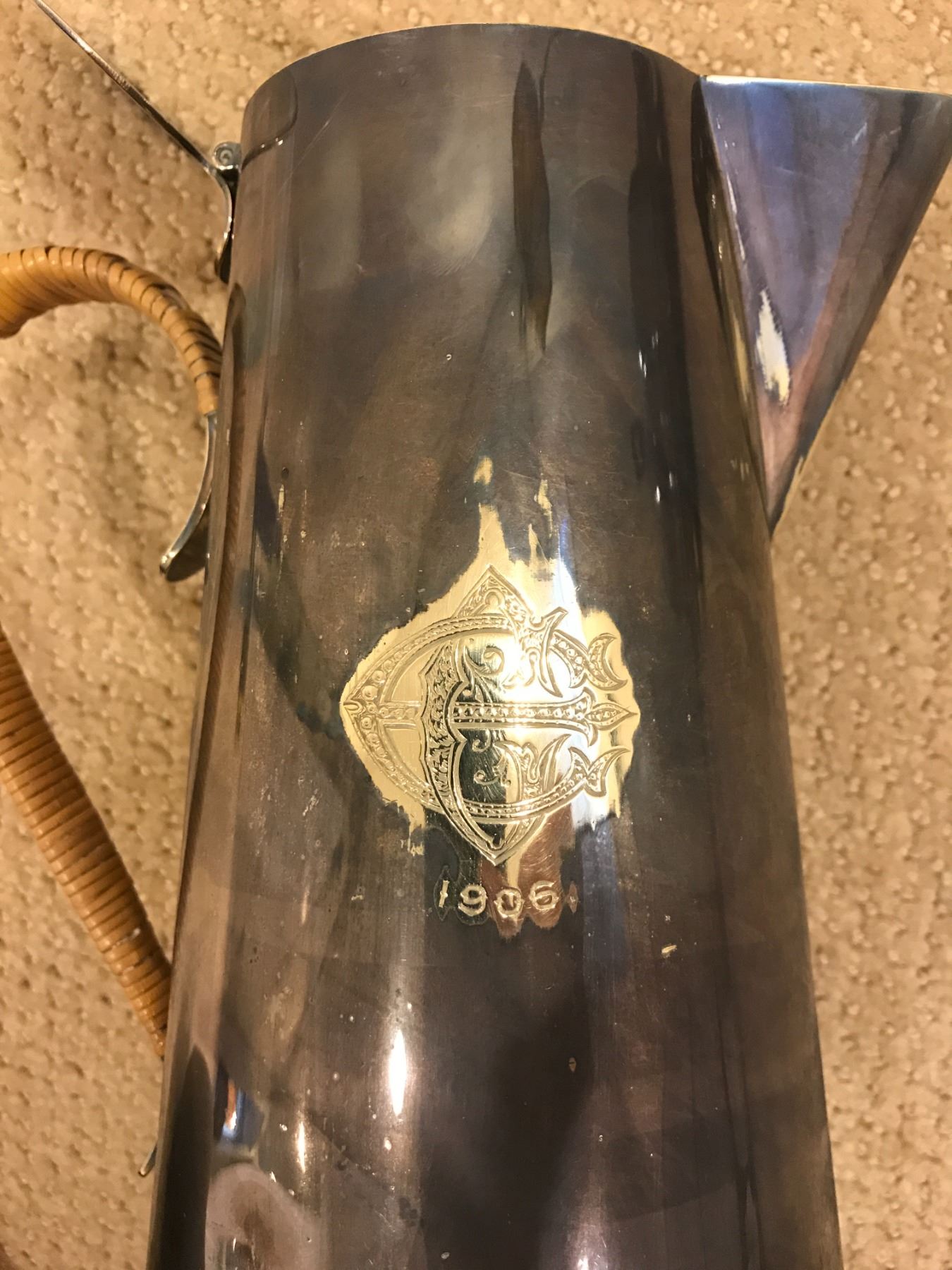 Large platter 10" W x 16" L x 10.5" H Benedict Canada 1826. Pitcher 7" x 8" Hwarranted Hnd and Silver Soldered 1368. Creamer 6" x 4" H ERNS. Sugar Bowl 5 1/4" x 5 1/2" H AWERNS