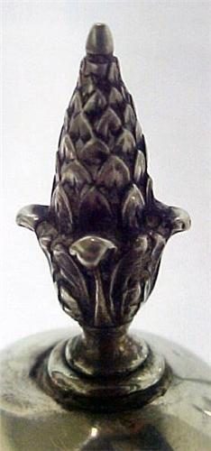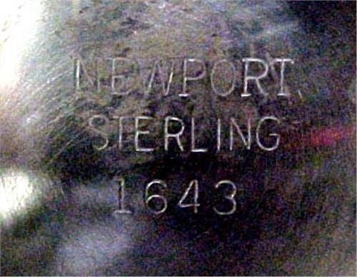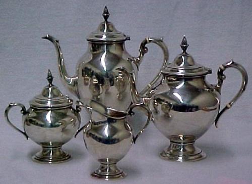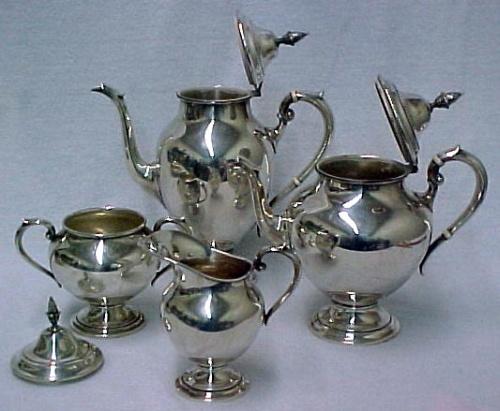 Sterling silver tea and coffee service by Newport Sterling; acorn finial on lids; S-shaped spouts; service includes coffee pot with hinged lid 11 1/4" high; teapot with hinged lid 9" high; creamer 5 1/4" high with gold wash interior; and sugar with lid 6