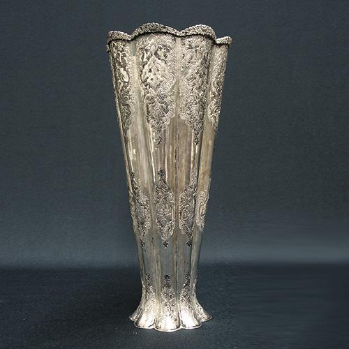 Sterling silver trumpet vase; applied floral swag decoration on rim; fluted sides with chased and engraved decoration; slightly flared base; engraved on bottom "From J.J.A. Arsenal, To: Msgt D.A. Maples; partial hallmark on bottom; late 19th C.; 10 3/4" high x 4" diameter; 22.2 oz (no visible defects)