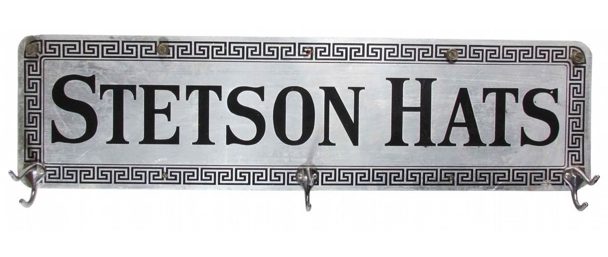 Stetson Hats Aluminum Hat Rack. Mounted on wood frame. Good condition. 30 X 8 inches.