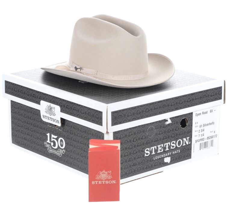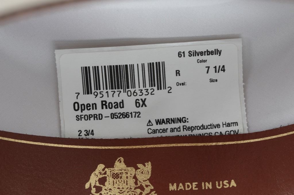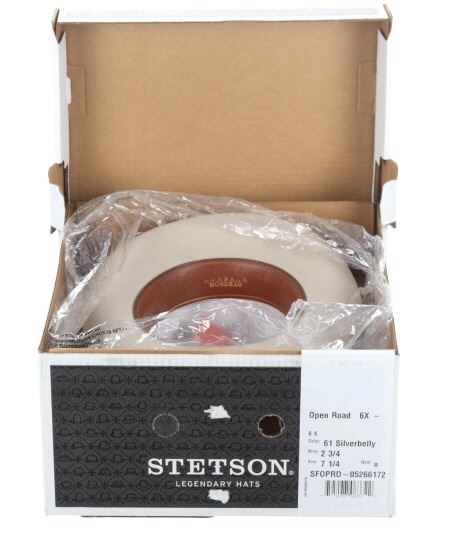 Featured in this lot is this Stetson XXX6XXX "Open Road" silverbelly colored hat. The hat features a silver belly color 6X pure fur felt hat with a hat size of 7 1/4. The hat is featured in its original box and a Stetson pamphlet explaining care. The condition of this hat is good, with no obvious signs of damage. The measurements of this hat are 5" x 11" x 13 1/2".
