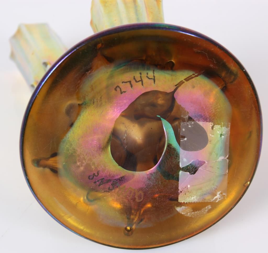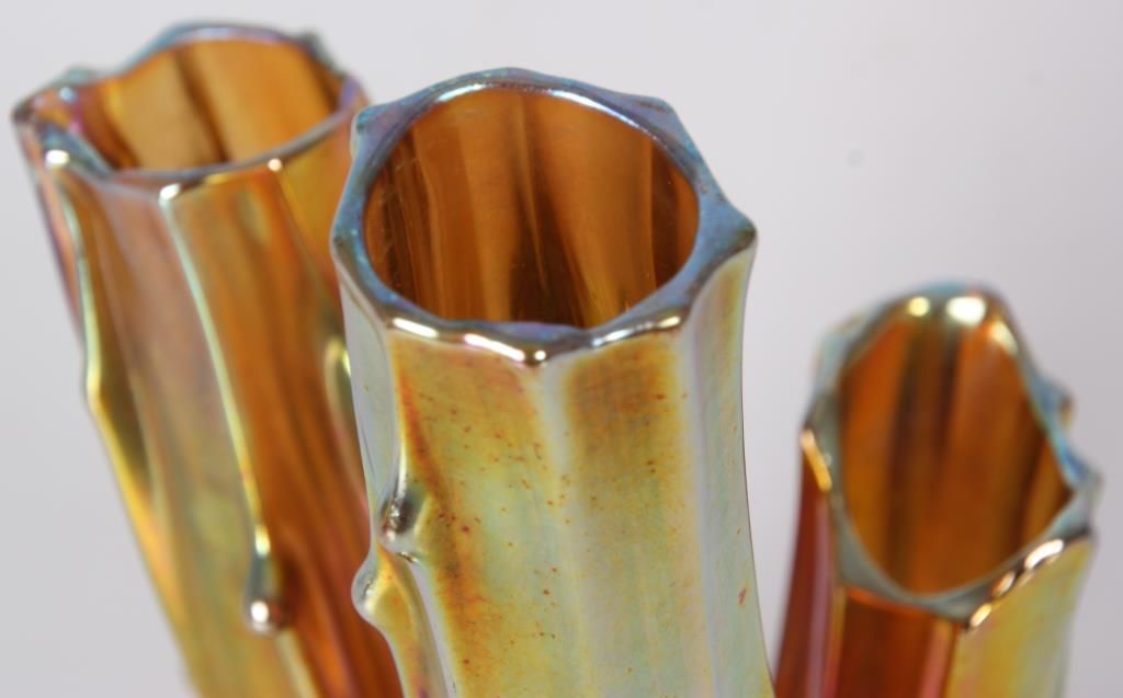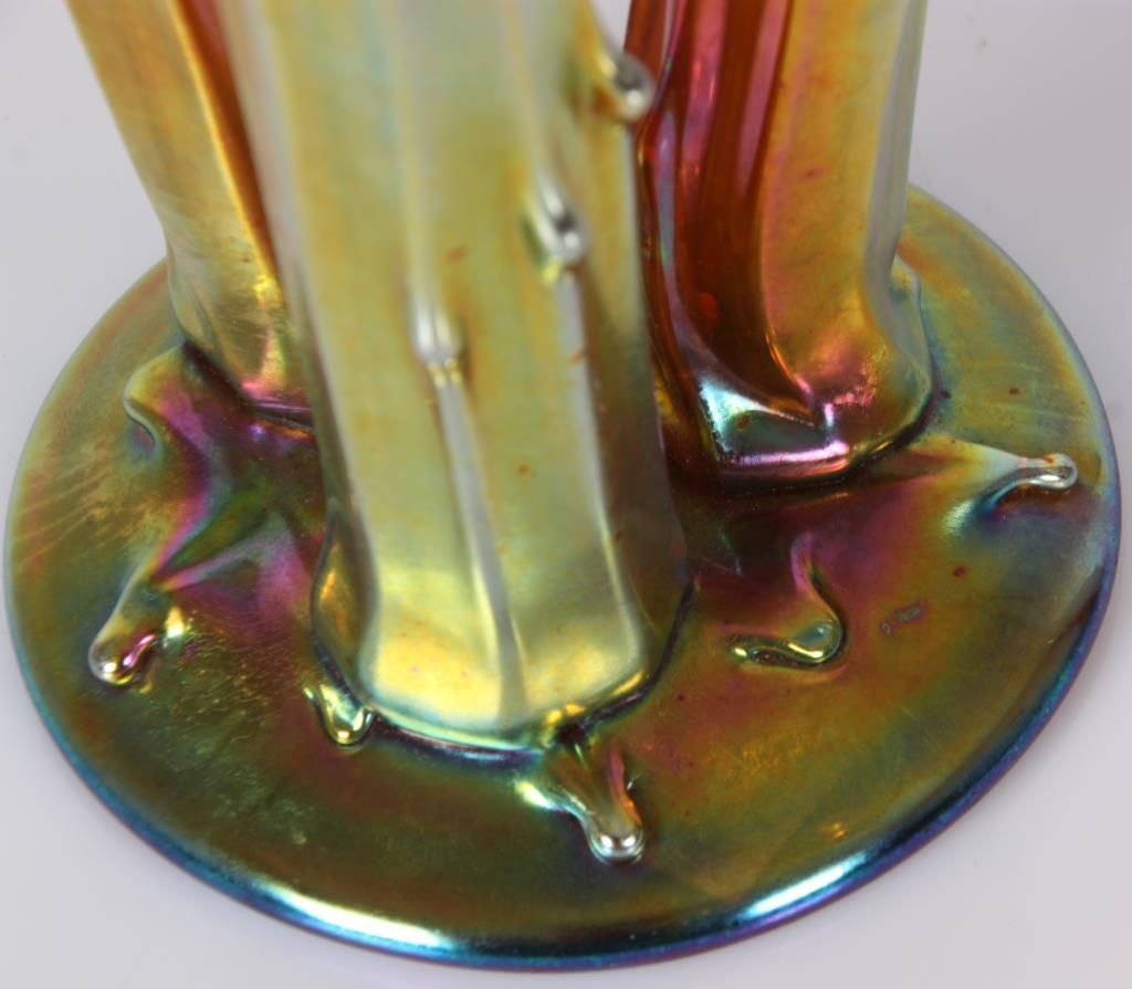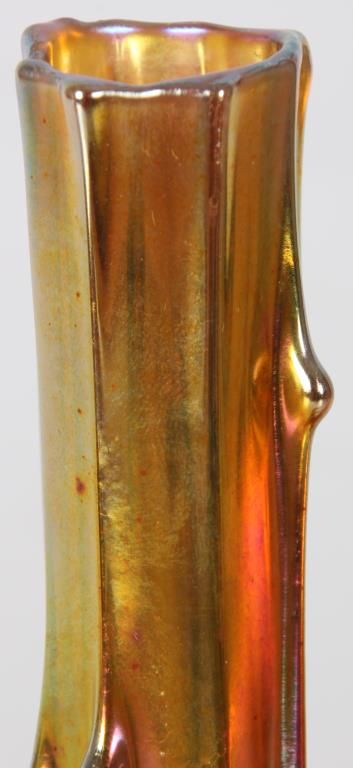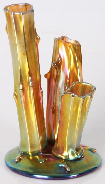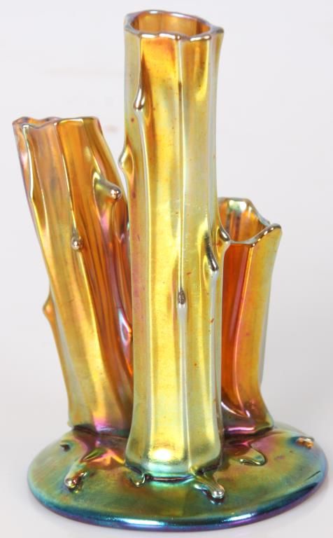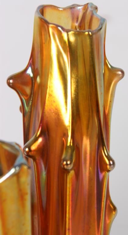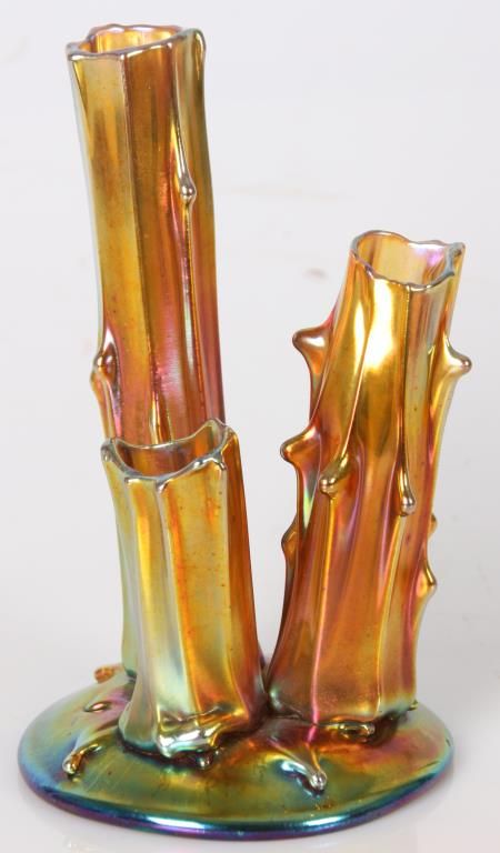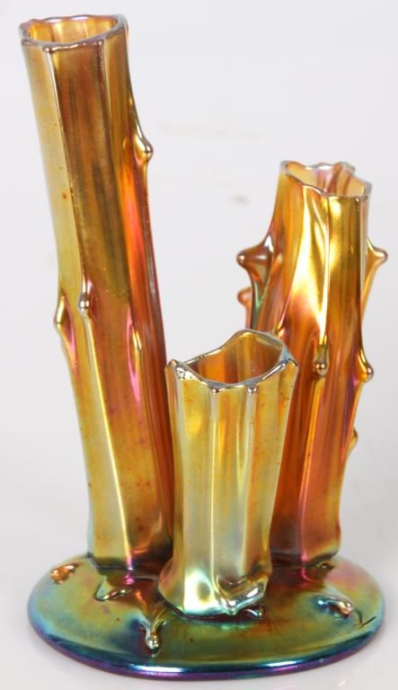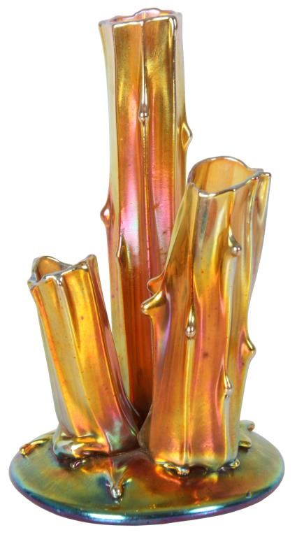 Steuben Aurene Triple Tree Trunk Vase. Has 3 ribbed tree trunk shaped flutes of different lengths splaying out off of the domical platform base; a bold gold iridescent finish with fiery orange in the stems and hints of green and blue in the base. Signed on the bottom "Aurene 2744". 6 in. high.