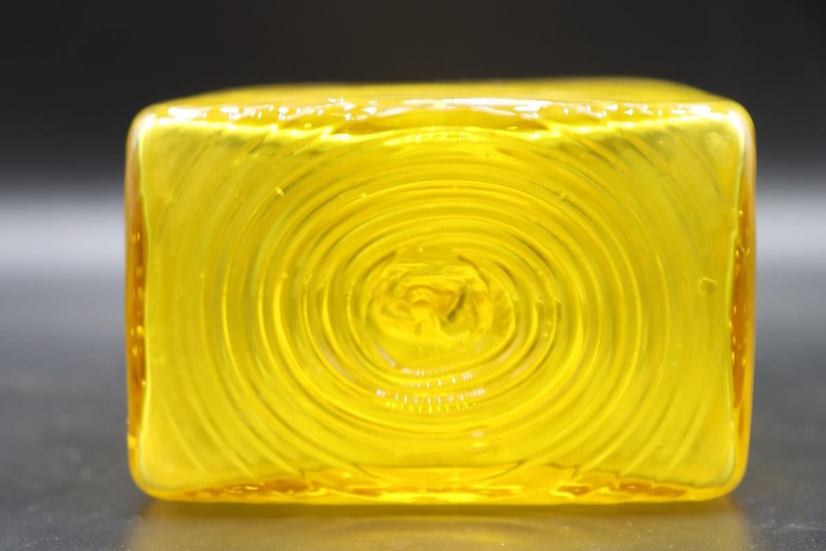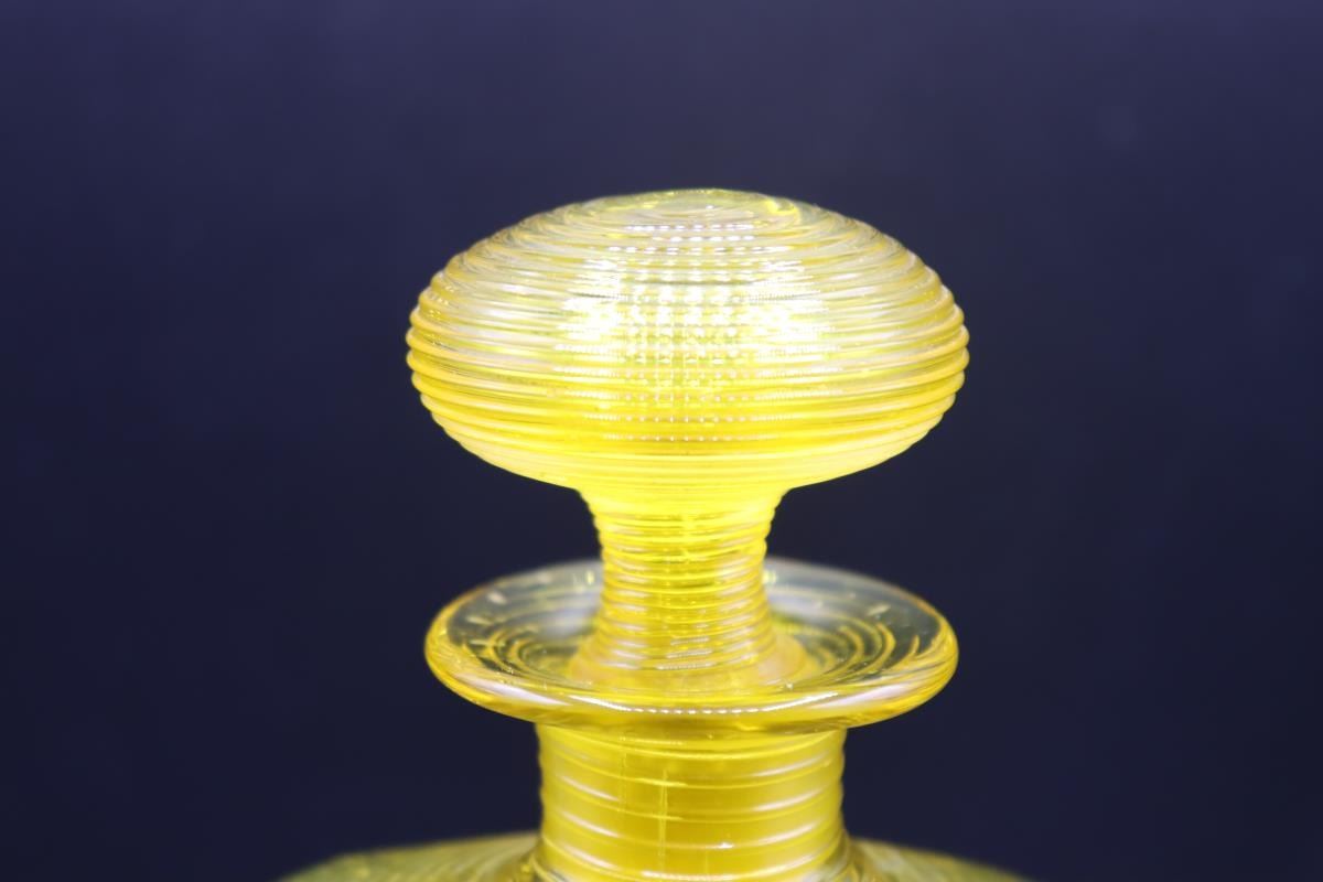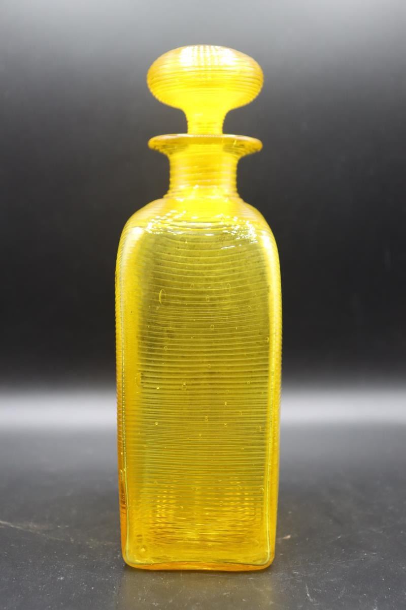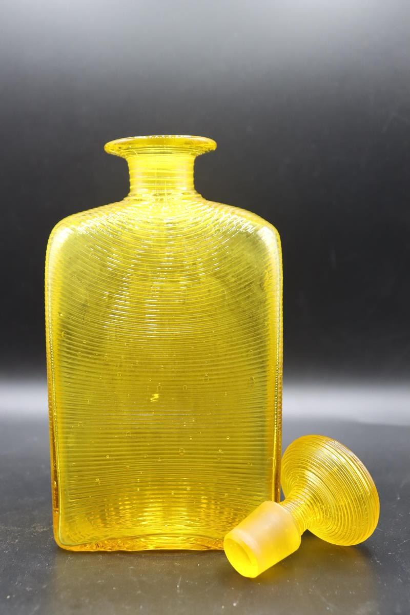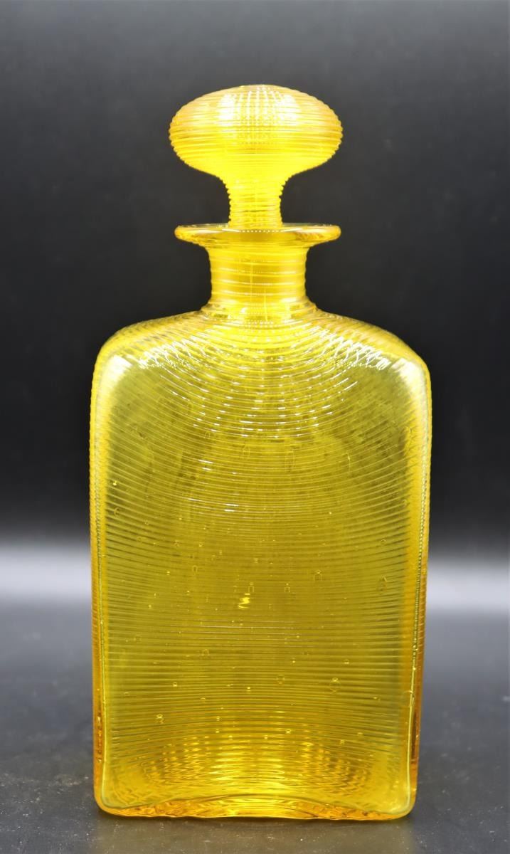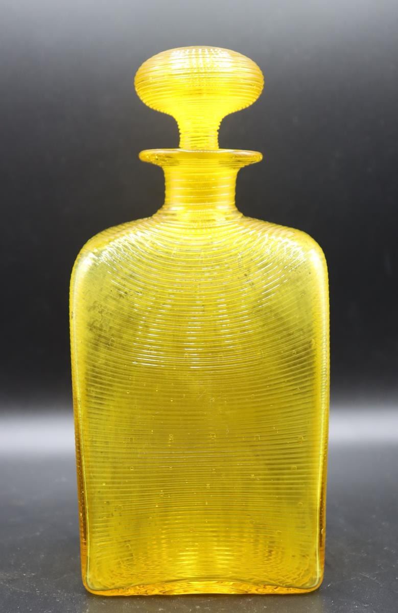 Steuben Bristol Yellow decanter w stopper, signed. 4 x 2 1/2 x 9 in.