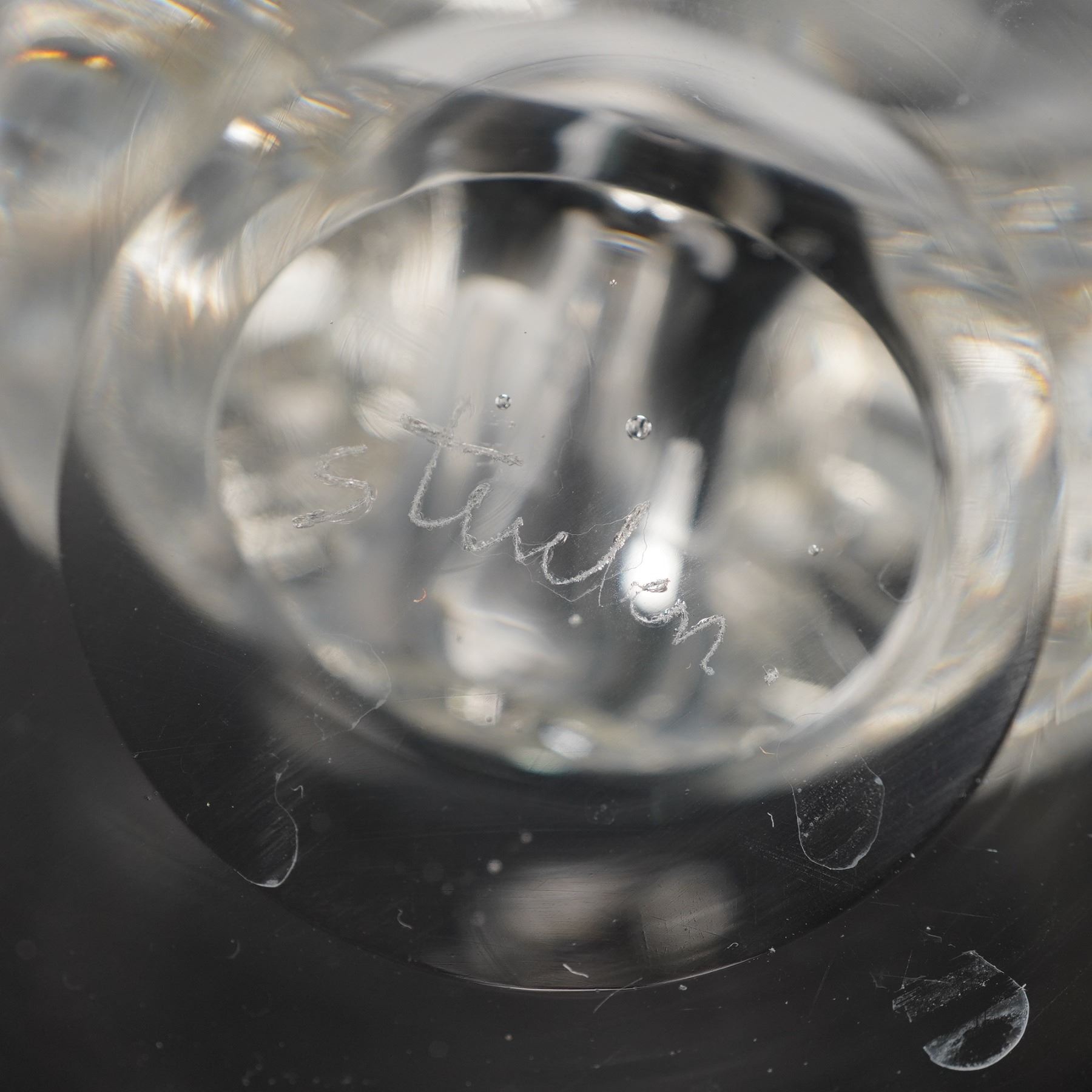 A clear crystal candlestick by Steuben, crafted with the brand's hallmark clarity and precision. The piece features an elegant sculptural design with graceful, curving scroll-like elements rising from a circular base to support a rounded candle cup. Finely balanced and expertly polished, it reflects the timeless artistry for which Steuben is celebrated. The underside is etched Steuben in script.