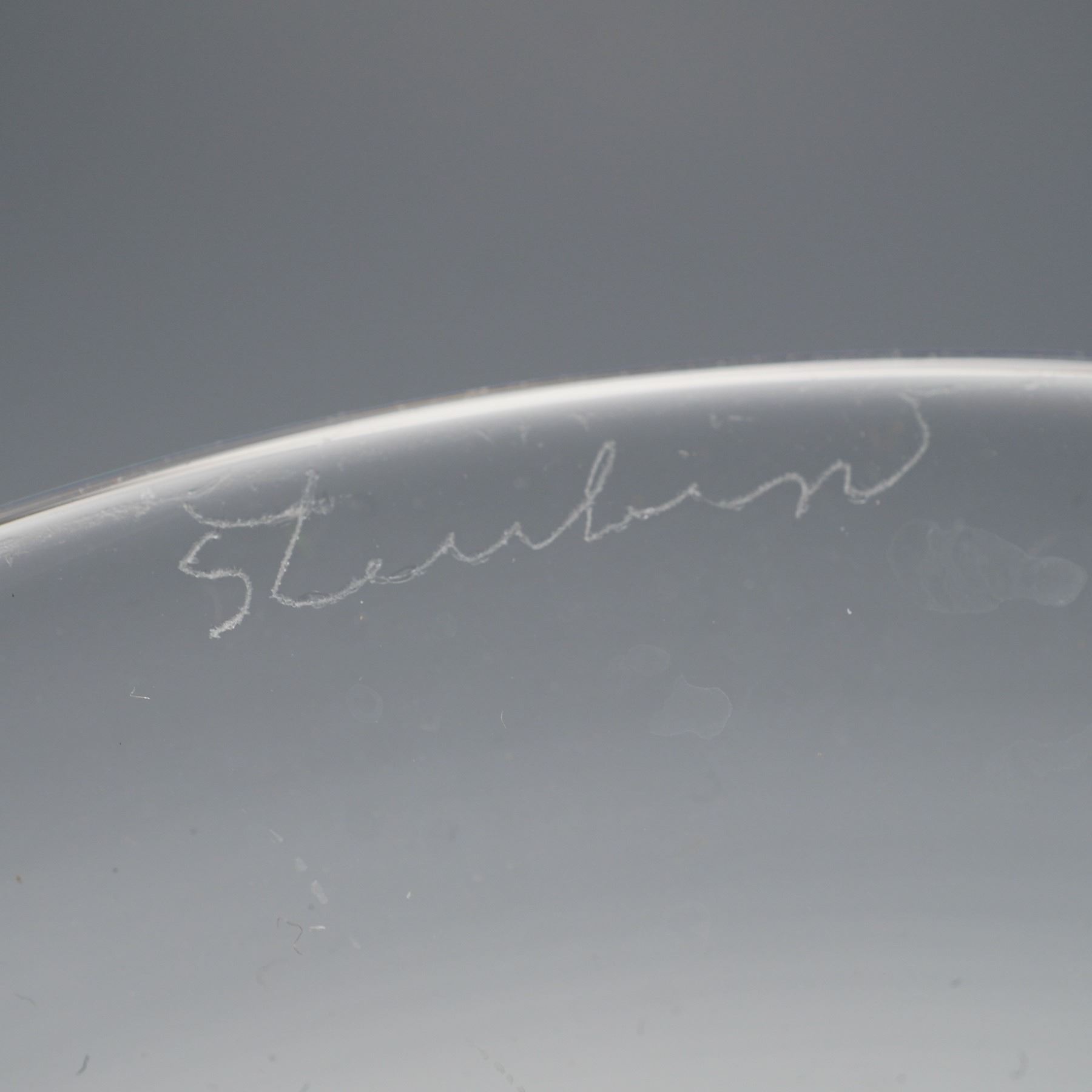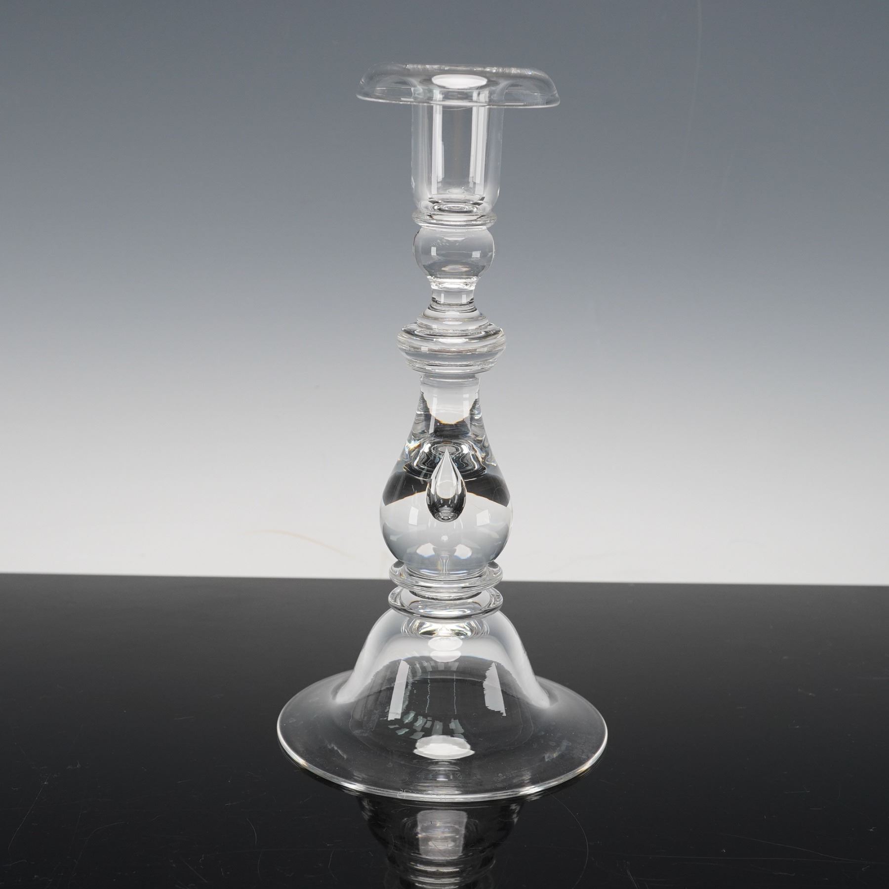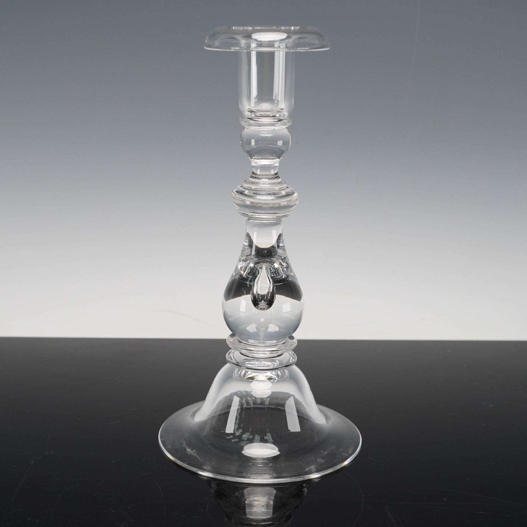 A beautifully crafted Steuben crystal candlestick from the iconic Teardrop pattern series. This elegant design features a baluster form with a distinctive teardrop-shaped air bubble suspended within the stem, demonstrating the technical mastery and visual purity for which Steuben is renowned. Hand-blown in clear crystal, the piece has a smooth, wide circular foot and a polished candle cup that reflects light with remarkable brilliance. The underside bears the engraved Steuben signature, confirming its authenticity. This sophisticated form exemplifies the refined simplicity and flawless optical clarity characteristic of mid-20th-century Steuben design.
