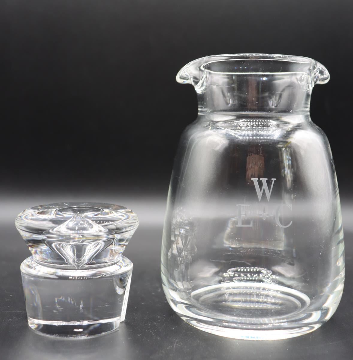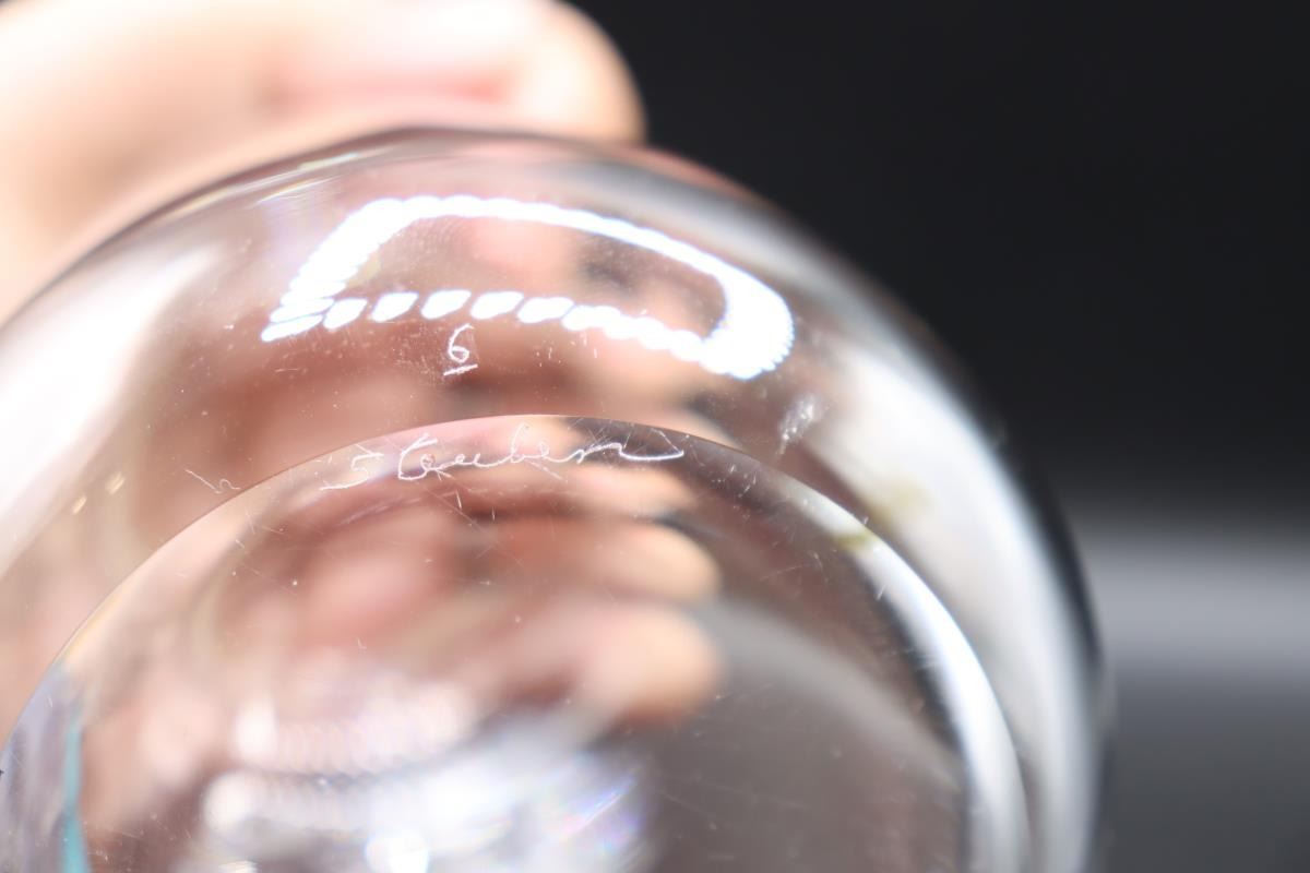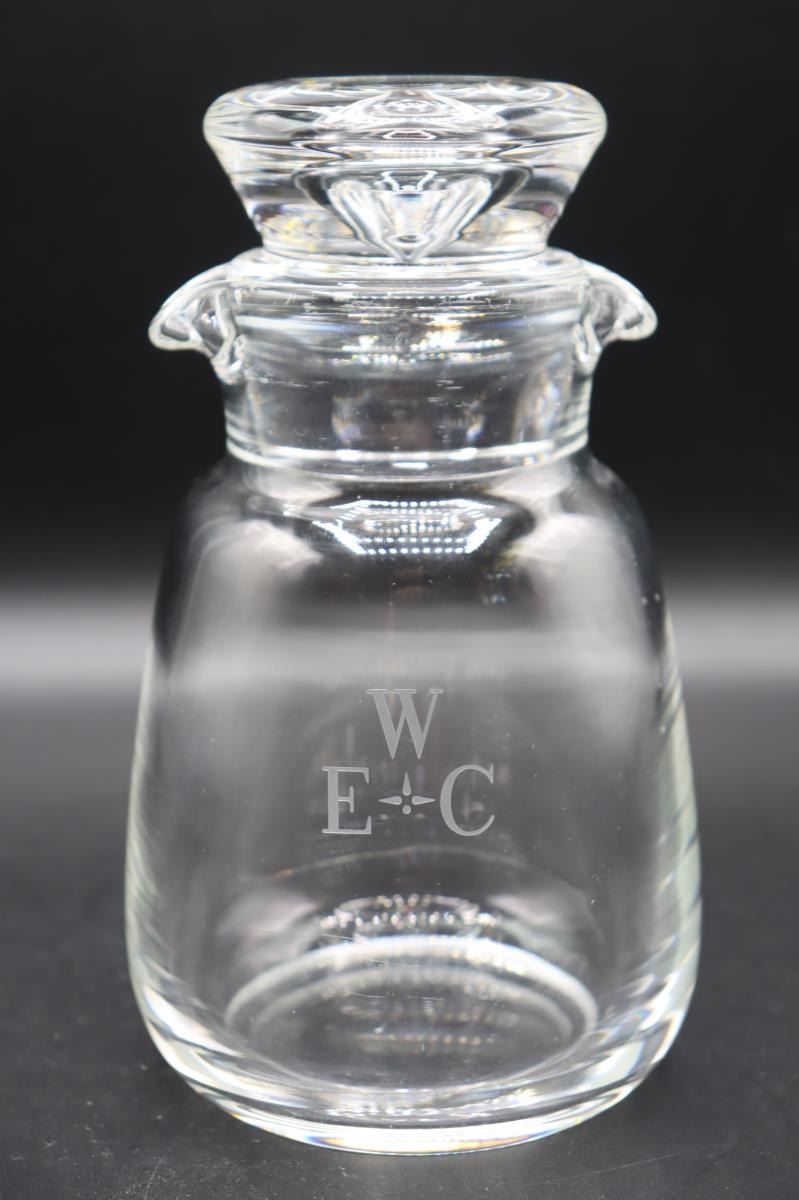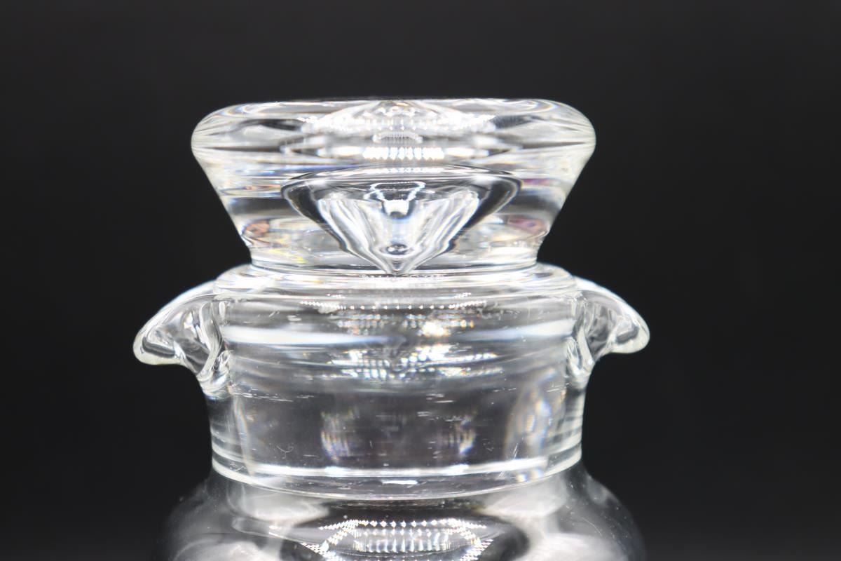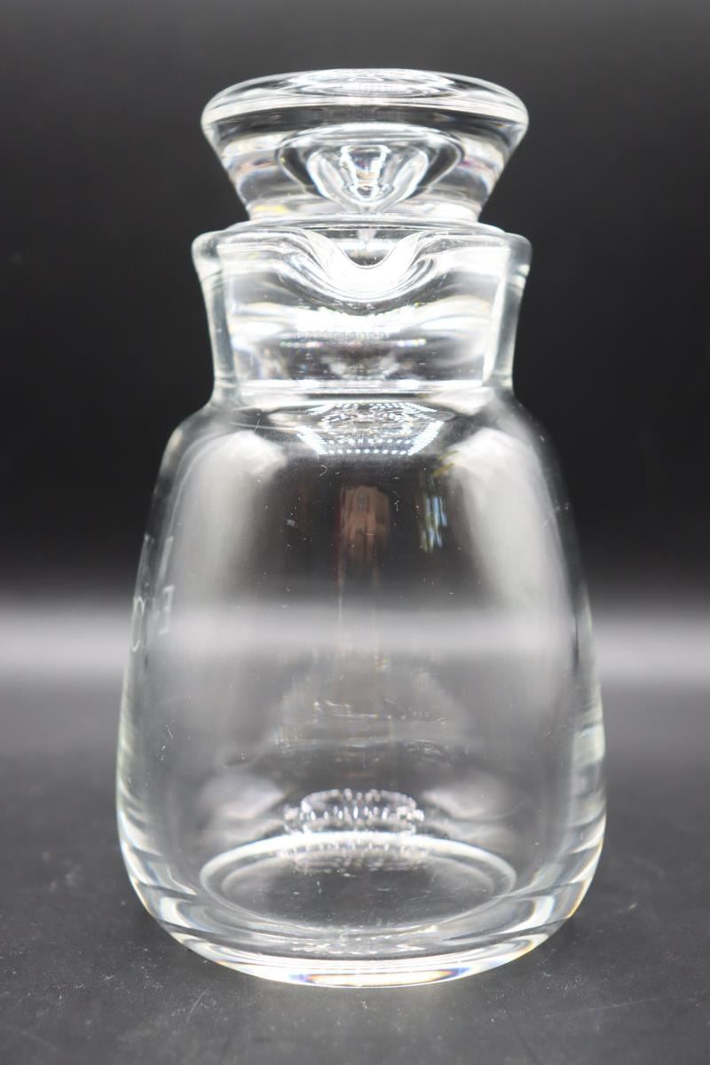 Steuben Cocktail Shaker, signed. Double Spout tear drop. Initialed on one side. 4 x 4 x 6 1/2 in.
