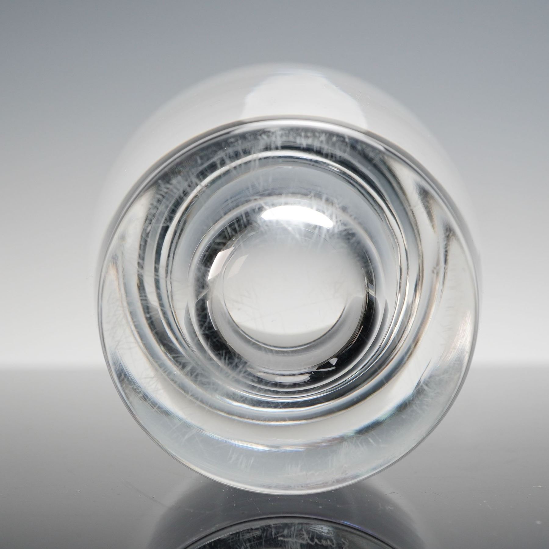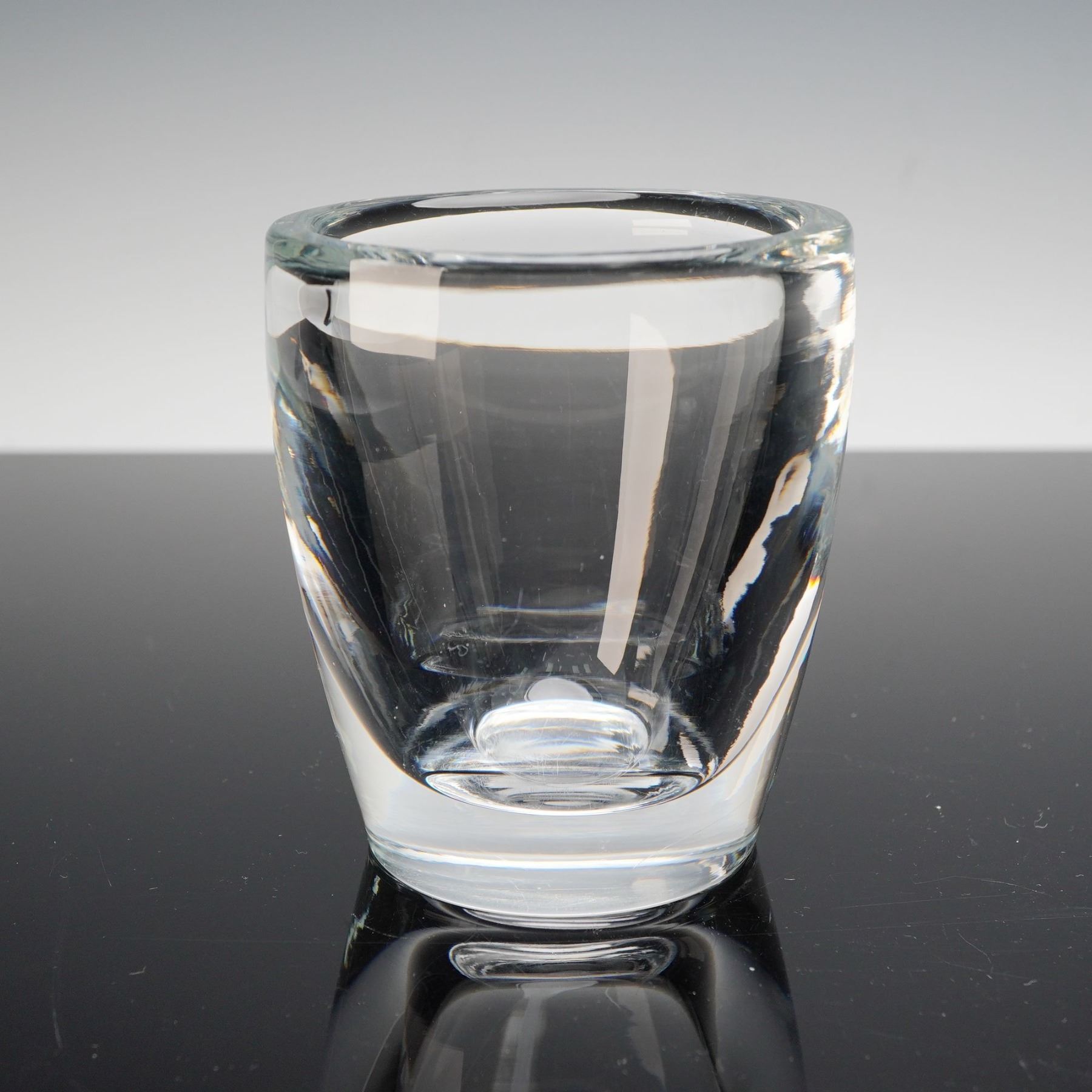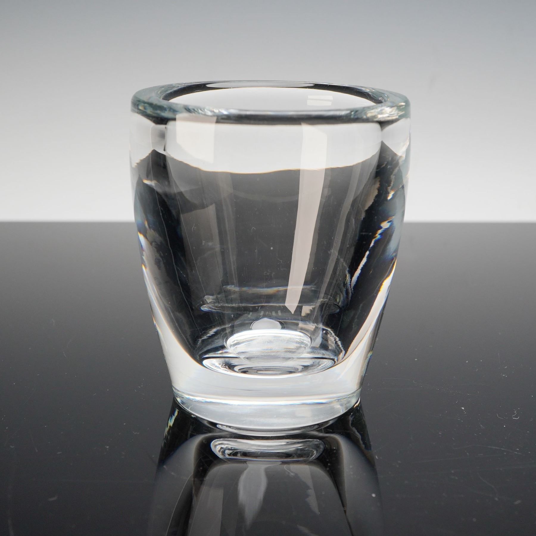 This finely crafted Steuben crystal vase showcases the company's signature clarity and precision. Standing approximately 4 inches tall, the vase features a clean, modern form with thick, sculpted walls that accentuate the brilliance and weight of Steuben glass. The base bears the etched Steuben signature, confirming its authenticity, and shows light surface wear consistent with gentle use. Elegant in its simplicity, this compact vase embodies Steuben's timeless design aesthetic and would make a distinguished addition to any collection of fine American crystal.