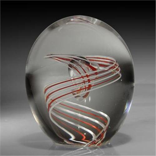 Steuben Glass high-domed spiraling latticinio paperweight. A large elongated bubble floats at the center of the piece, surrounded by a multi-thread spiral of red and white latticinio, which curls down to a clear base. Signed. Diameter 3 1/8".