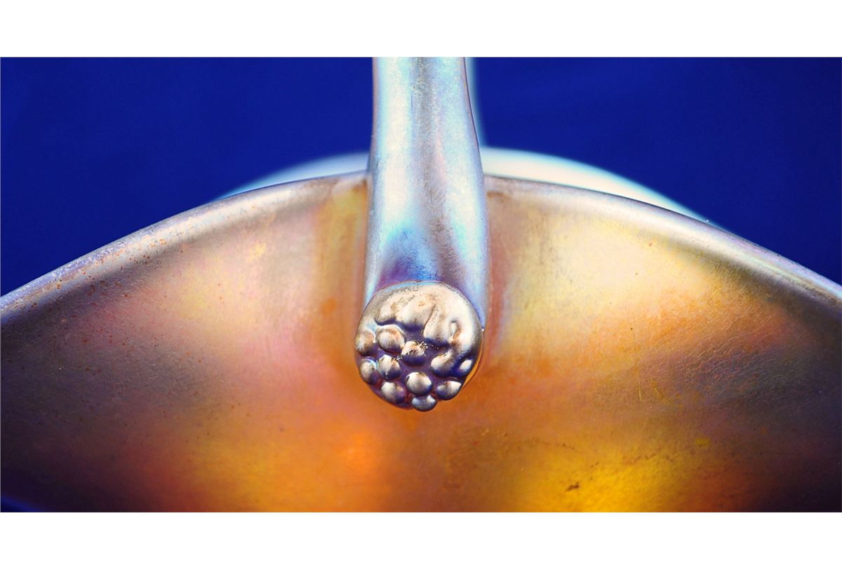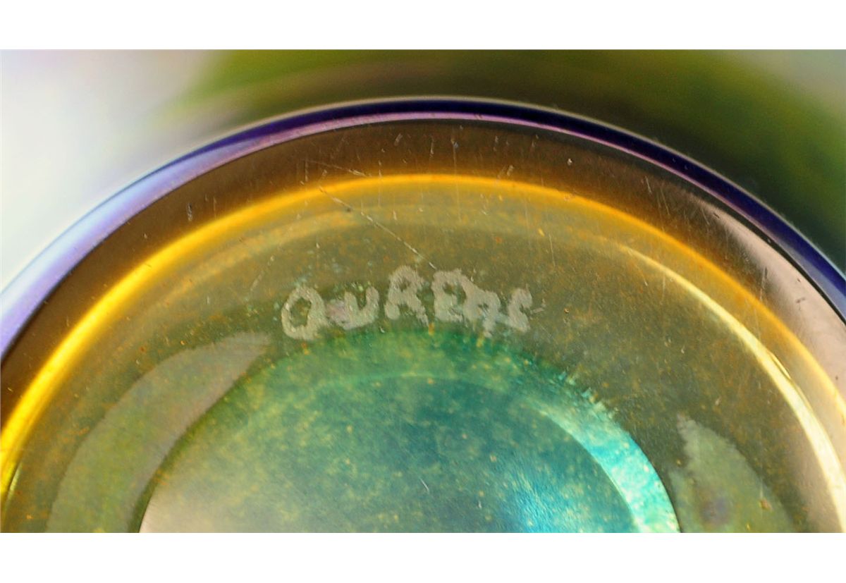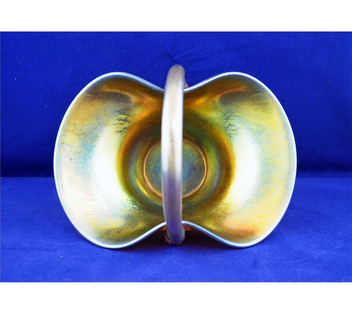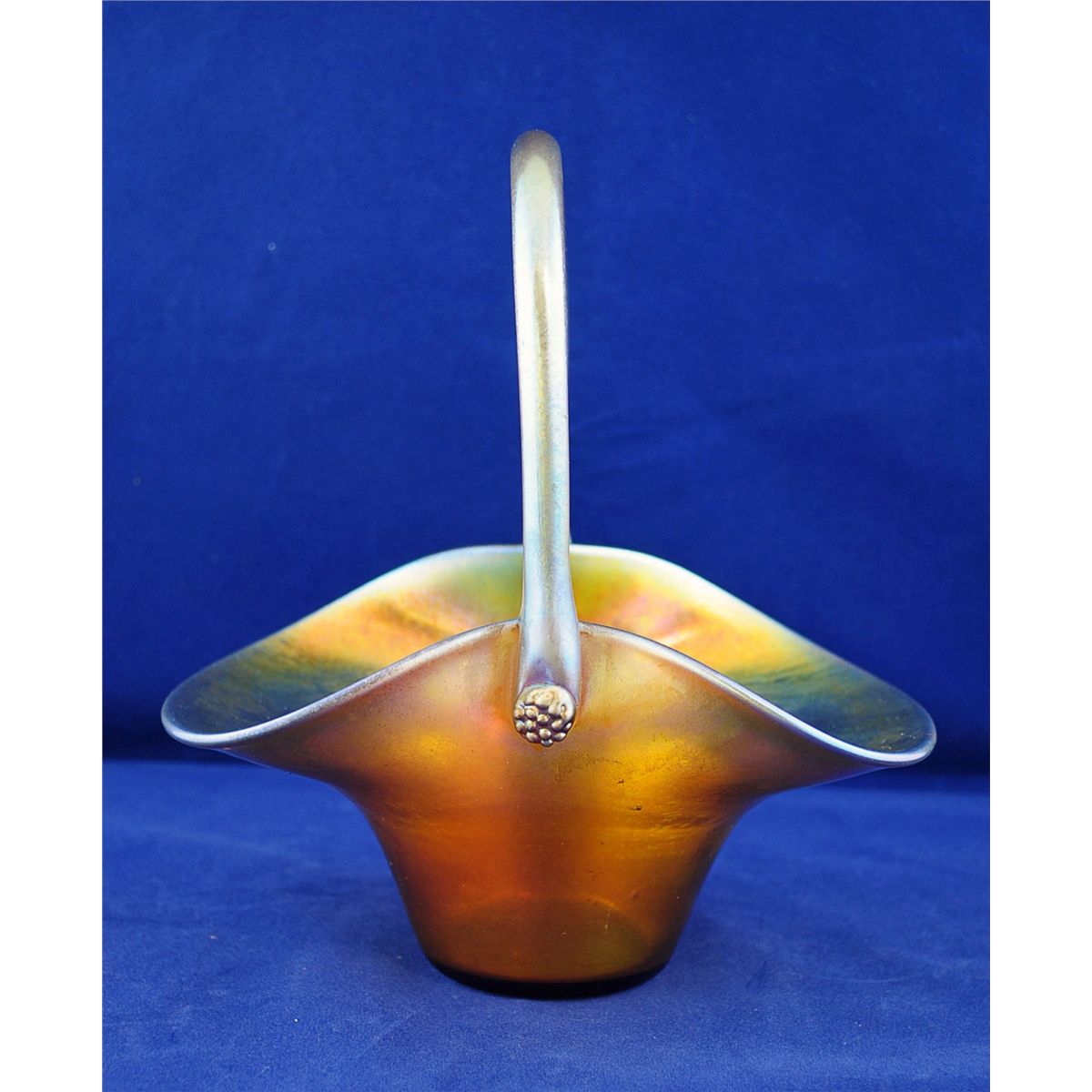 Steuben Gold Aurene Shape 453 Basket , blue and gold iridescent hues, decorative buttons handle, signed Aurene 453 under the base, polished pontil. 8.5? high;Excellent condition.