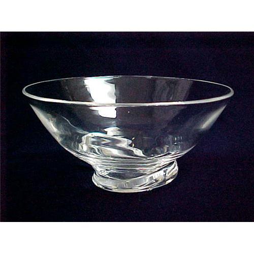 A clear glass lead crystal bowl signed ?Steuben? on the bottom. The circular bowl is 7 ¼ inches in diameter and stands 3 5/8 inches tall. It is a plain glass bowl with a graceful swirl at the base. The base is heavily scratched on the bottom and one of the swirls is broken where it merges with the base. There is also about a ½ inch square area on the inside of the bowl that has many small abrasions. The damage is only noticeable upon close examination and from a short distance all you see is a classic Steuben bowl.