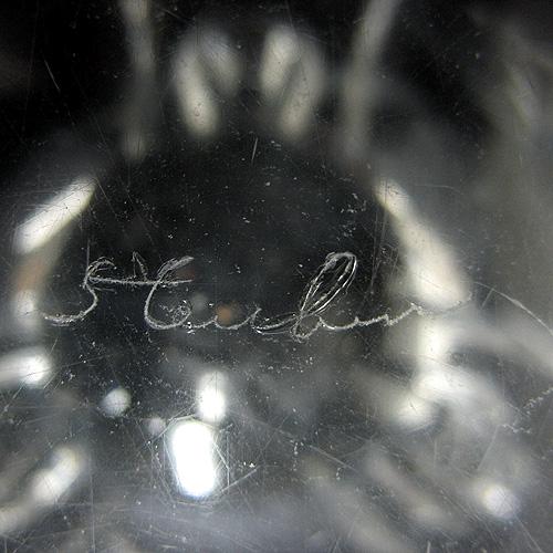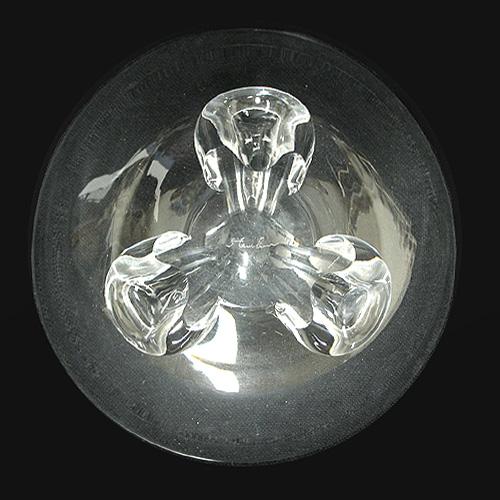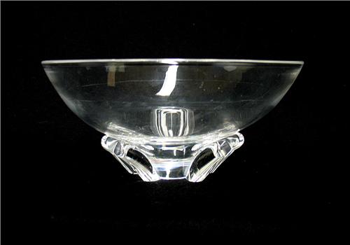 Steuben bowl; round form on attached tripod base; diamond point etched signature on bottom; mid to late 20th C.; 3 1/4" high x 8" diameter (no visible defects)