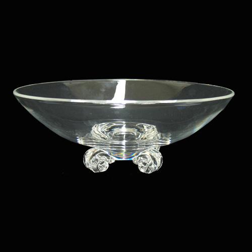 Steuben crystal centerbowl with four scroll feet; diamond point etched signature on bottom; mid to late 20th C.; 4" high x 10 1/2" diameter (no visible defects)
