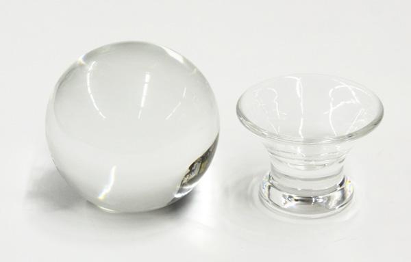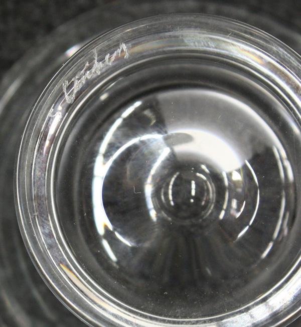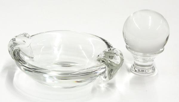 (lot of 3) Steuben group, the bowl having applied handles of teardrop form flanking the tapering body 2.5''h, together with a sphere on stand 5''h overall, all marked on base