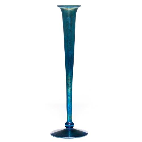 Steuben vase, slender ribbed and footed form in blue Aurene glass, marked Aurene, 12"h