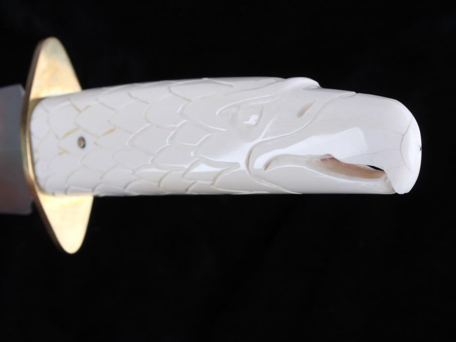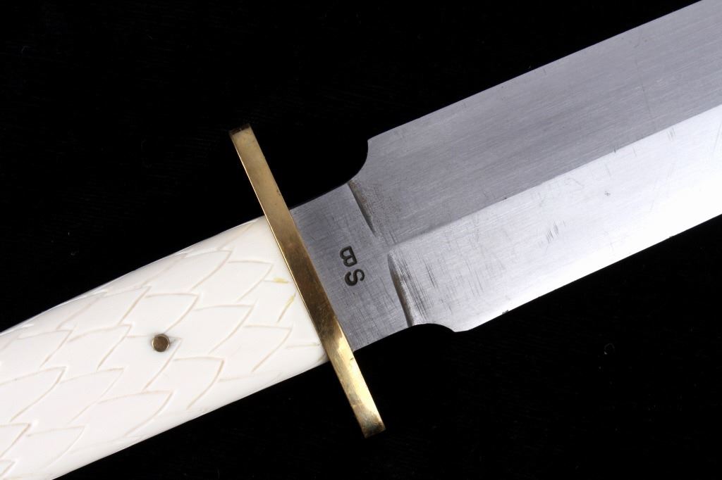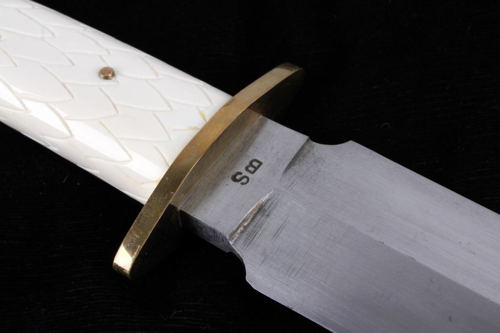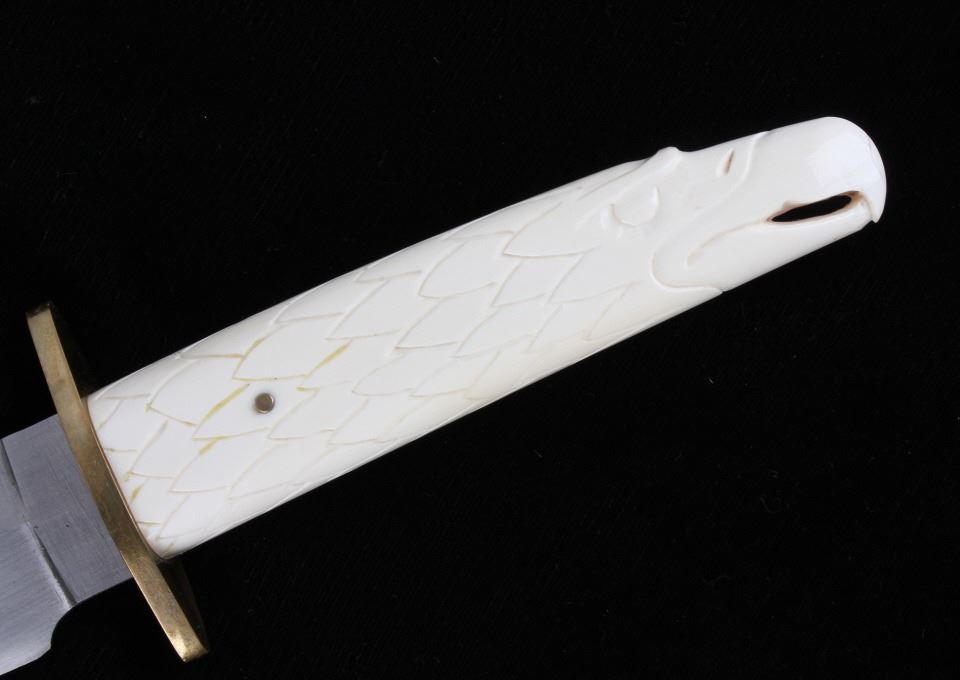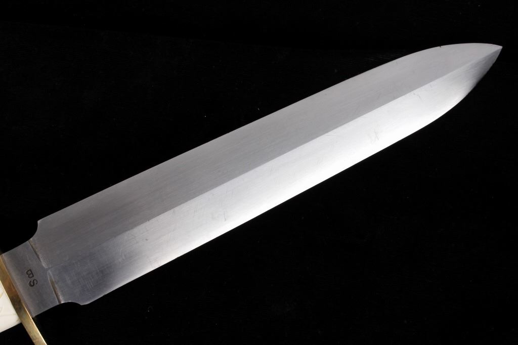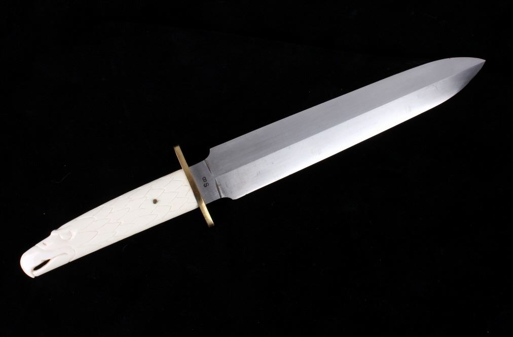 For your consideration is this double sided dagger with carved walrus tusk handle from Montana knife maker Steve Brooks from Butte, Montana. The blade shows a sharp design and clean fishing with the Montana Artist hallmark shown above brass hilt: SB. The handle is made from carved walrus tusk ivory and is crafted into the likeness of an eagle with feathers and beak given great attention to detail. Steve Brooks is a Butte, Montana collectible custom knife maker. The condition of this dagger is good and shows a well polished sharp double blade with no blemishes or oxidation of the blade; the walrus tusk shows slight patina to the carved feathers of the eagle design. The measurements of this blade is 16" x 3" with a blade length of 10".