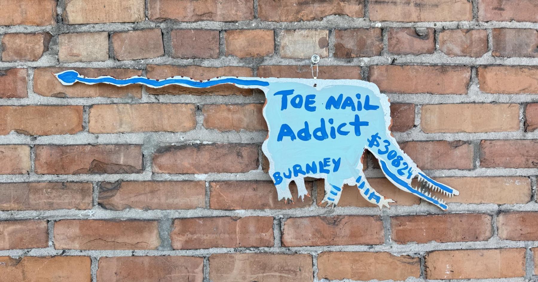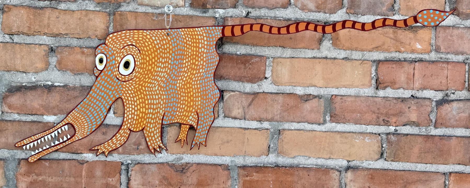 Painted Tin. Title is Toe Nail Addict. 32" by 10 1/8". From the Artist My name is Steve Burnley. I’ve been drawing since I was old enough to hold a pencil. I’ve always drawn creatures and such. I’m 50 years old. It’s a long story on how I got started doing these. I grew up in Thomson, Ga. Zip code 30824. I just started writing $30824 on the back one day and it stuck. My family moved to a house in Thomson in 1979. Our property touched the library property so I spent ten thousand hours looking at books. I drew creatures as soon as I could draw. The painting is kind of new to me. I’ve been painting roosters for a long time and I don’t like doing those anymore. I have zero art education other than art class in high school I’m still learning Teaching myself.