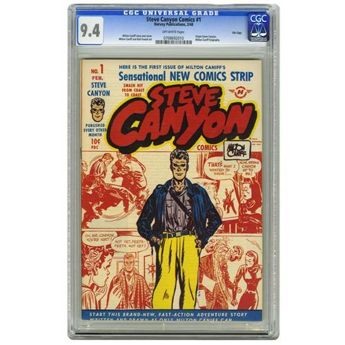 <B>Steve Canyon #1 File Copy (Harvey, 1948) CGC NM 9.4 Off-white pages.</B></I> The work of the acclaimed Milton Caniff is on display both on the cover and inside this issue. Steve Canyon's origin is among the stories told inside the comic. There's also a biography of Caniff and some art by Bob Powell. Overstreet 2006 NM- 9.2 value = $255. CGC census 4/06: 3 in 9.4, 4 higher.