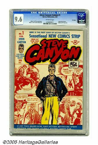<B>Steve Canyon #1 File Copy (Harvey, 1948) CGC NM+ 9.6 Off-white pages.</B></I> The work of the great Milton Caniff is on display both on the cover and inside this issue. Steve Canyon's origin is among the stories told inside the comic. There's also a biography of Caniff and some art by Bob Powell. Overstreet 2005 NM- 9.2 value = $255. CGC census 3/05: 4 in 9.6, none higher.