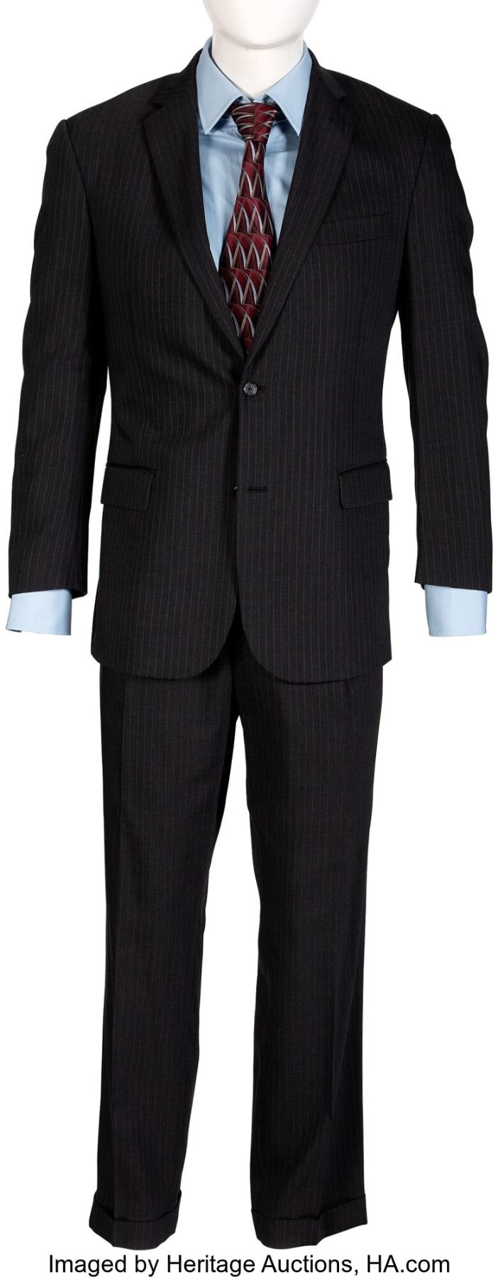 Steve Carell Screen Worn Business Attire fromThe Office.Business attire from the American adaptation of the British series created by Ricky Gervais and Stephen Merchant. Worn by the Anchorman/40-Year-Old Virginstar Steve Carell, he played awkward office manager Michael Scott. Includes: The suit by Society Brand in grey worsted wool with light blue pinstripes includes: 1)Single-breasted blazer in size 42R; 2)Matching trousers in size 36 x 32; 3)Light blue dress shirt by Hugo Boss in size 16 35/36, 4)Silk necktie by Gianfranco Ruffin in maroon, silver and gold. Overall, Near Fine condition. COAs from NBC Universal and Heritage Auctions.
