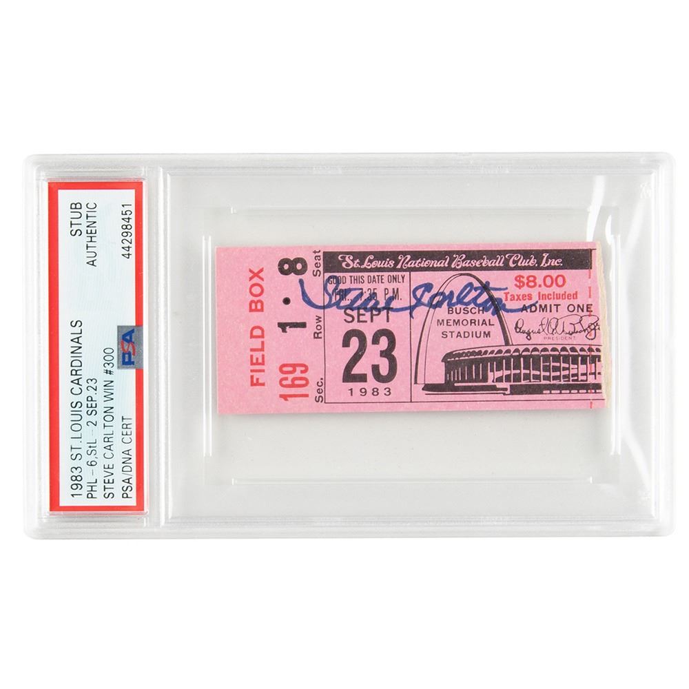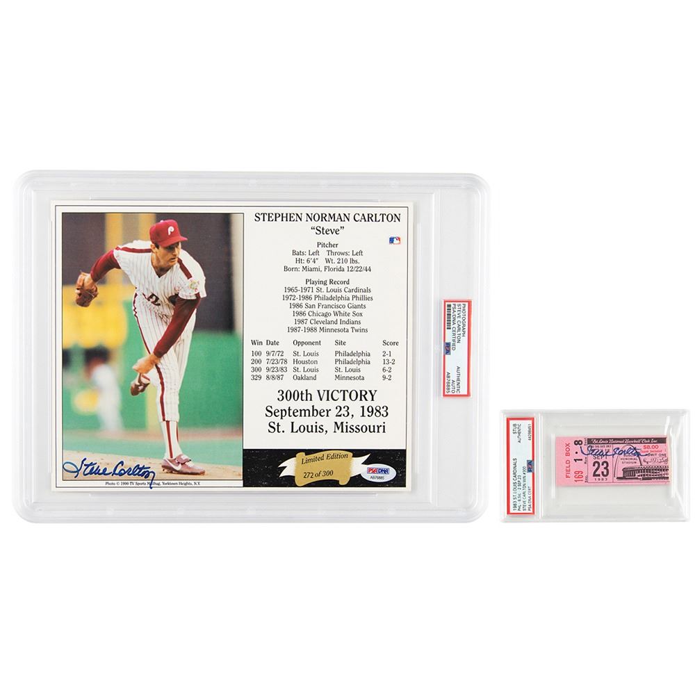 Two items signed by Steve Carlton, both encapsulated by PSA/DNA: a ticket stub from Steve Carlton's 300th win on September 23, 1983, signed in blue felt tip by Carlton and encapsulated by PSA/DNA; and a limited edition color 10 x 8 cardstock photo honoring his historic 300th victory, numbered 272/300, signed in blue felt tip by Carlton and encapsulated by PSA/DNA. In overall fine condition.