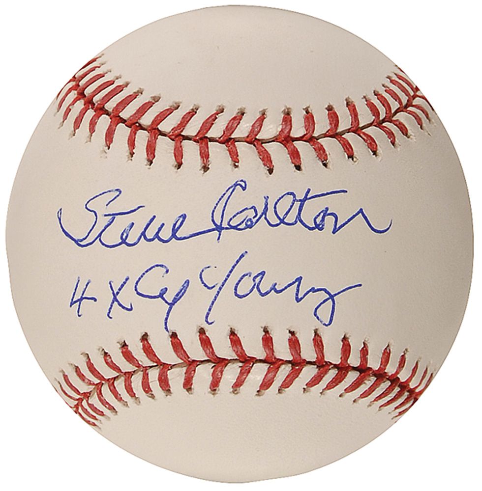 Official Rawlings Major League baseball signed in blue ballpoint on the sweet spot, “Steve Carlton, 4x Cy Young.” In very fine condition, with a JSA authentication label affixed to reverse.