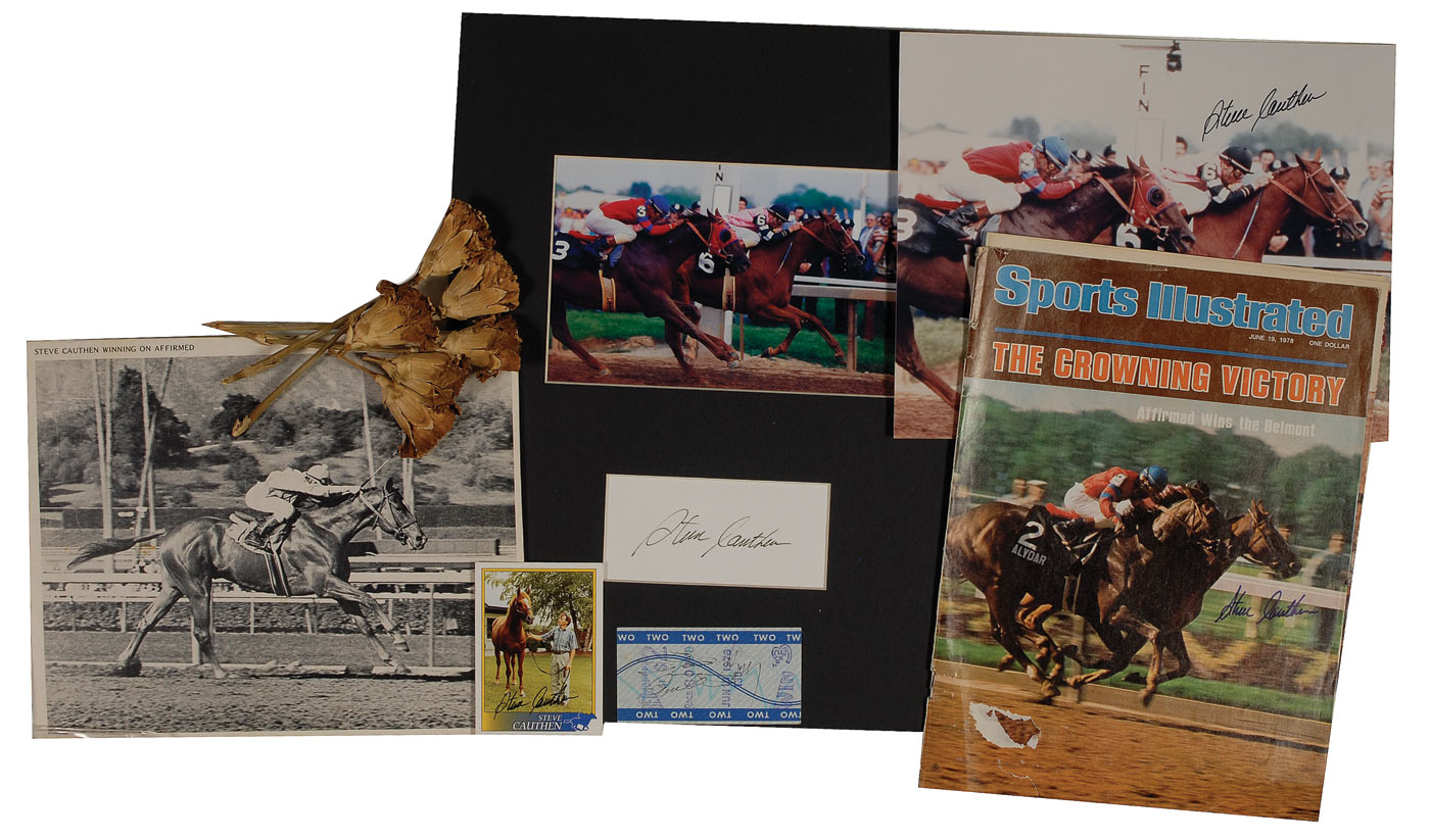Four items: color satin-finish 8 x 10 photo of Cauthen in a race signed in black felt tip; front cover of the June 19, 1978, Sports Illustrated showing Cauthen atop Affirmed signed in blue felt tip; 1993 Horse Star trading card signed in black felt tip; and a black felt tip signature on a 4.5 x 2.25 card matted with a color photo to an overall size of 11 x 14. Accompanied by four unsigned photos, a $2 winning ticket, and several dried flowers said to have come from the wreath of Affirmed obtained directly from the jockey by the consignor’s husband who was in charge of entertainment at Belmont Raceway.