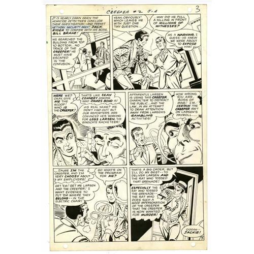 <B>Steve Ditko - Beware the Creeper #2, page 3 Original Art (DC, 1968).</B></I> Steve Ditko's sinuous art style was ideally suited for gritty, urban, crime-fighting superhero yarns and mystical, supernatural chillers. <B>Beware the Creeper</B></I> combined these elements into one of DC's most unforgettable Silver Age features. Ditko's storytelling on this page moves the viewers' eyes to skewed points of view and perspectives that heighten the emotional reactions of his characters to the events unfolding in the plot. Jack Ryder (the Creeper) springs into action in the last panel, and Steve Ditko's inking on this page is crisply detailed with dramatically spotted blacks. And how can you resist a 1960s page that mentions Sean Connery and James Bond? The image area of the piece measures 10" x 15", and the art is in Excellent condition.