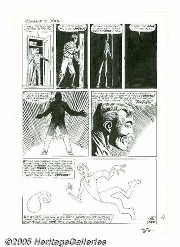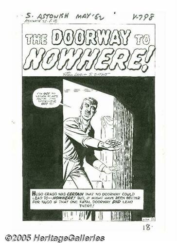 <B>Steve Ditko - Tales to Astonish #35 Complete 5-page Story "The Doorway to Nowhere" Original Art (Marvel, 1962).</B></I> Celebrated as the artist who brought Spider-Man and Dr. Strange to life, Steve Ditko also excelled at drawing fantasy short stories for "pre-hero" Marvel. Ditko's storytelling and inking on this chiller are flawless, and the large size art is ideal for showcasing his hall-of-fame talent. The image area of the art measures 12.5" x 18.5", and aside from a few whited-out areas used for lettering corrections, the art is in Excellent condition.