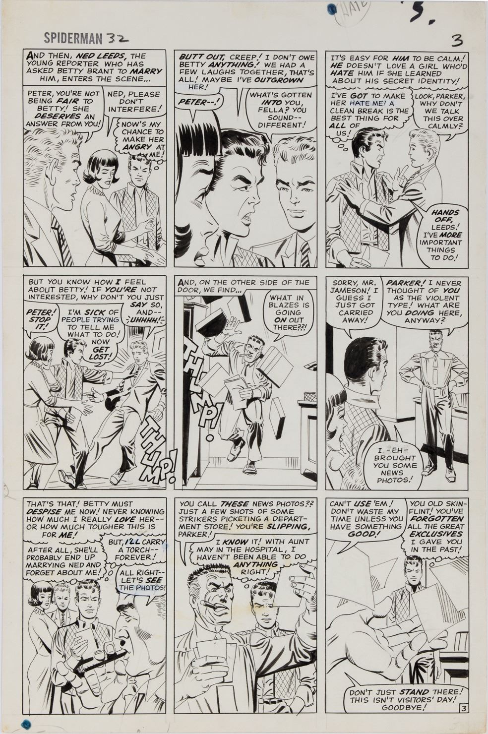 19. Steve Ditko original artwork for The Amazing Spider-Man #32 Page 3. (Marvel, 1966) Accomplished in pencil and ink on 13.5 x 20.5 in. large comic art stock. Steve Ditko certainly knew how to tell a visual story as seen in this great character-driven page showing not only the ups and downs that always followed "Peter Parker's" love life (usually due to his dual life as "Spider-Man" getting in the way), but also another classic scene between Peter and "J. Jonah Jameson" as ol' JJJ shows his own brand of..."generosity". Nice images of Peter, Jonah, Betty and Ned. In very good condition. $20,000 - $30,000