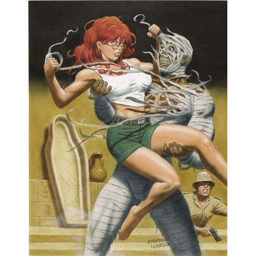 <B>Steve Fastner and Rich Larson - Mummy and the Red-head Illustration Original Art (undated).</B></I> Lara Croft -- eat your heart out! Penciller Rich Larson and airbrush artist Steve Fastner give us another take on <I>tomb raiding</B></I>, as a reanimated mummy finds that this buxom redhead is more feisty than expected. Beautiful work, measuring 8.5" x 11" overall, and in Excellent condition.