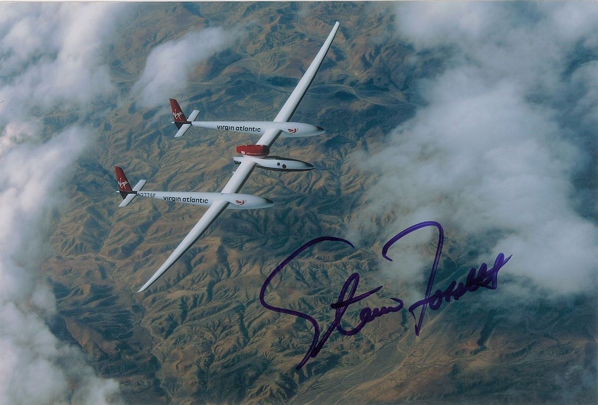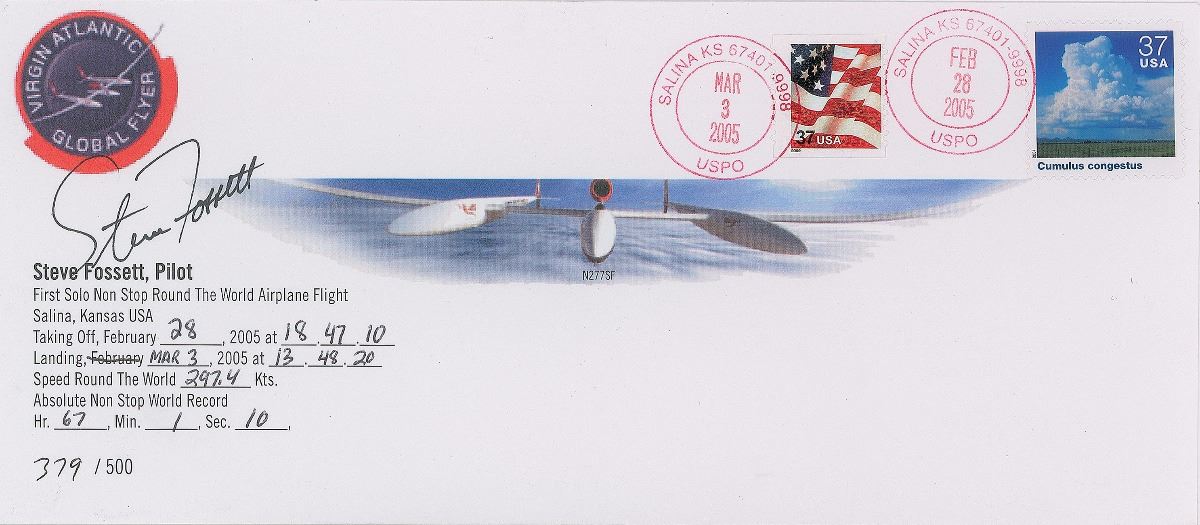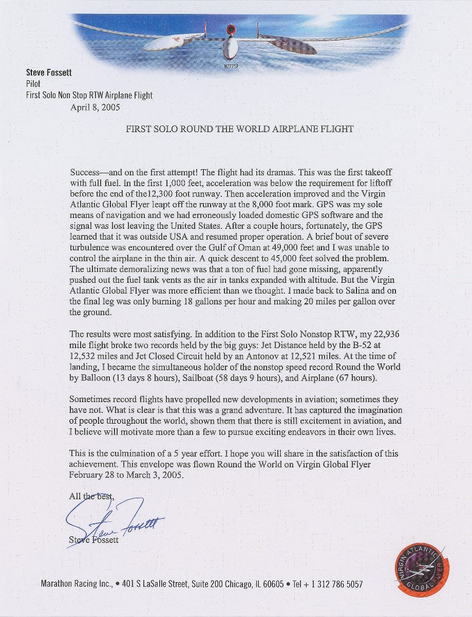 Three items: a TLS, personal letterhead, dated April 8, 2005, in part: “Success—and on the first attempt!…In addition to the First Solo Nonstop RTW, my 22,936 mile flight broke two records…At the time of the landing I became the simultaneous holder of the nonstop speed record Round the World by Balloon (13 days 8 hours), Sailboat (58 days 9 hours), and Airplane (67 hours)…This is the culmination of a 5 year effort. I hope you will share in the satisfaction of this achievement. This envelope was flown Round the World on Virgin Global Flyer February 28 to March 3, 2005”; the aforementioned limited edition 9.5 x 4 postal cover with a cachet honoring Fosset’s first solo nonstop round-the-world flight, numbered 379/500, signed in black ink; and a color glossy 6 x 4 photo of Fosset’s Virgin Global Flyer soaring high above mountainous terrain, signed in blue felt tip. In overall fine condition.